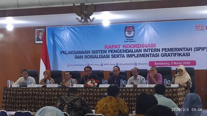 SEMARANG- Kamis (5/3/2020), KPU Karanganyar menghadiri undangan dari KPU Provinsi Jawa Tengah dalam rangka Rapat Koordinasi Pelaksanaan Sistem Pengendalian Intern Pemerintah (SPIP) dan Sosialisasi serta Implementasi Gratifikasi bertempat di Aula 1 lantai 3 Kantor KPU Provinsi Jawa Tengah Jalan Veteran Nomor 1 A Semarang. Rapat Koordinasi dihadiri oleh Ketua dan Anggota KPU Provinsi Jawa Tengah, Sekretaris dan Jajaran Fungsional KPU Provinsi Jawa Tengah, Ketua KPU, Sekretaris KPU, serta Anggota KPU Kabupaten/Kota Divisi Hukum dan Pengawasan dari 35 Kabupaten Kota se Jawa Tengah. Hadir sebagai Narasumber perwakilan dari Inspektorat KPU RI dan Komisi Pemberantasan Korupsi (KPK).