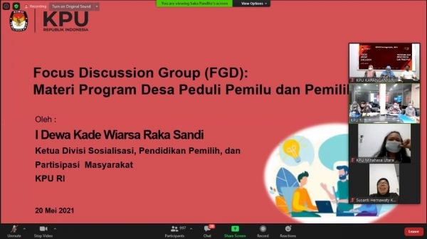 KARANGANYAR – Komisi Pemilihan Umum Republik Indonesia menggagas adanya program Desa Peduli Pemilu dan Pemilihan (DP3) Tahun 2021. Dalam rangka DP3 tersebut, KPU mengadakan focus group discussion (FGD) Kamis, (20/05/2021). KPU Karanganyar menyimak program DP3 melalui daring.