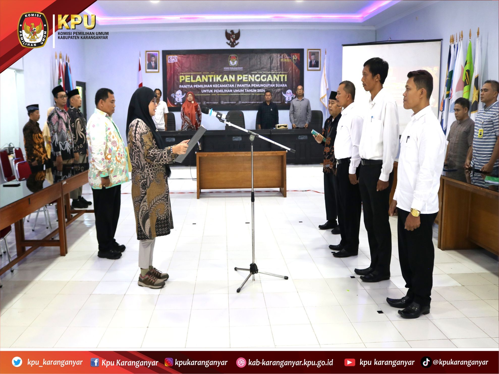 Ketua KPU Karanganyar, Triastuti Suryandari melantik dan mengambil sumpah janji dari calon pengganti PPS dari 3 Kecamatan tersebut. Acara pelantikan dan pengambilan sumpah janji disaksikan oleh Kasubbag TPPPHM, Eko Handoko dan Kasubbag Hukum dan SDM, Smaragung Wibowo. Selain itu, turut hadir Ketua Panitia Pemilihan Kecamatan (PPK) Karanganyar, PPK Mojogedang dan PPK Jatipuro serta Bawaslu Kabupaten Karanganyar. (AB)