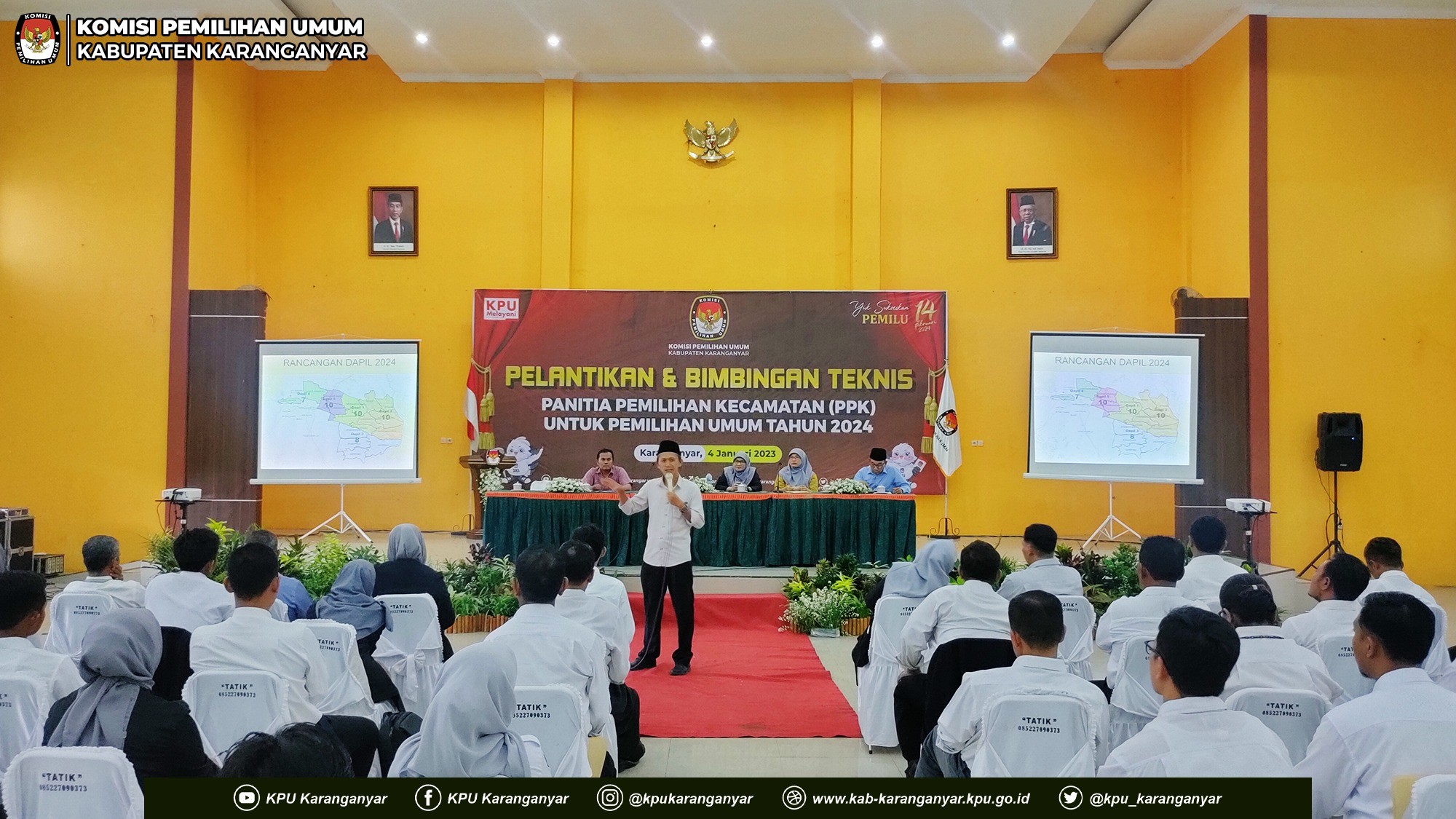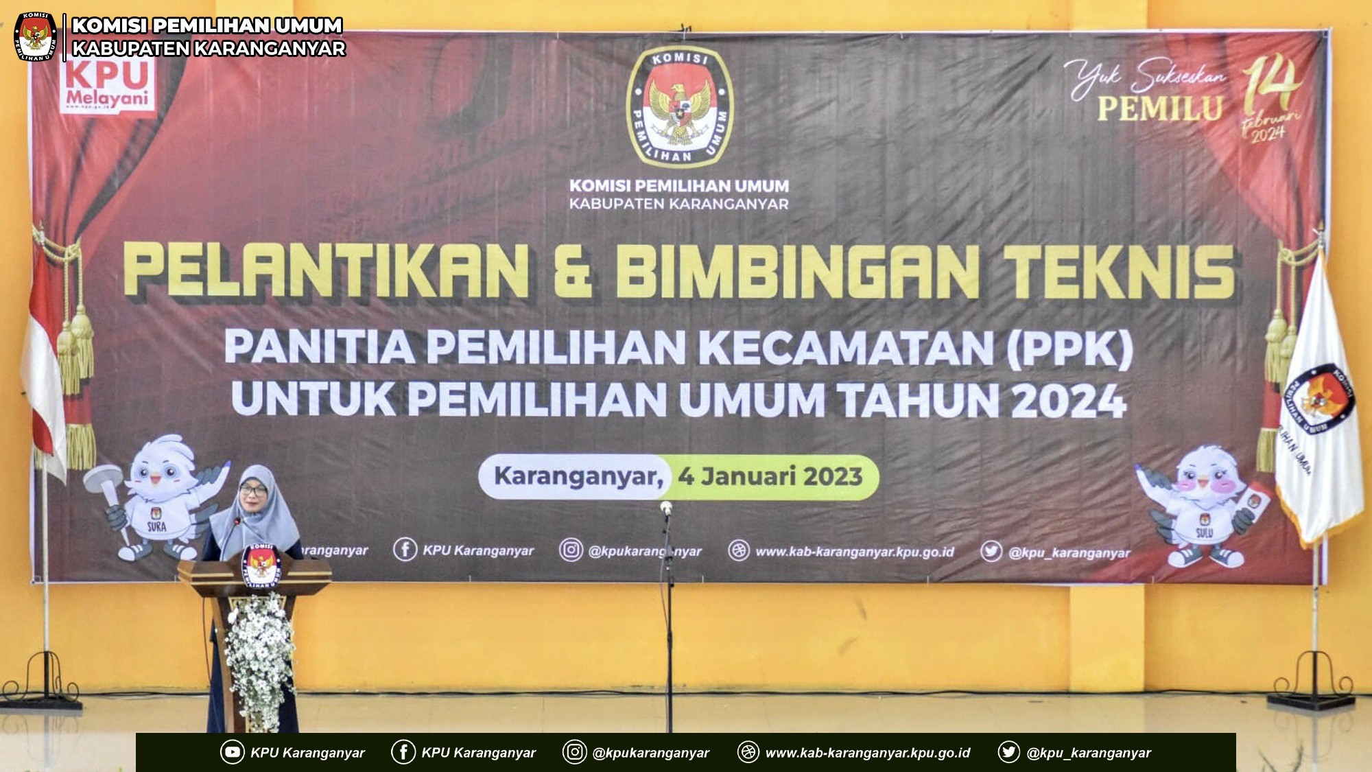 KARANGANYAR - Komisi Pemilihan Umum (KPU) Kabupaten Karanganyar menggelar Pelantikan Panitia Pemilihan Kecamatan (PPK) untuk Pemilihan Umum Tahun 2024, Rabu (4/1/2023). bertempat di Gedung GRHA PGRI Kabupaten Karanganyar, kegiatan pelantikan dilanjutkan bimbingan teknis bagi PPK se-Kabupaten Karanganyar.