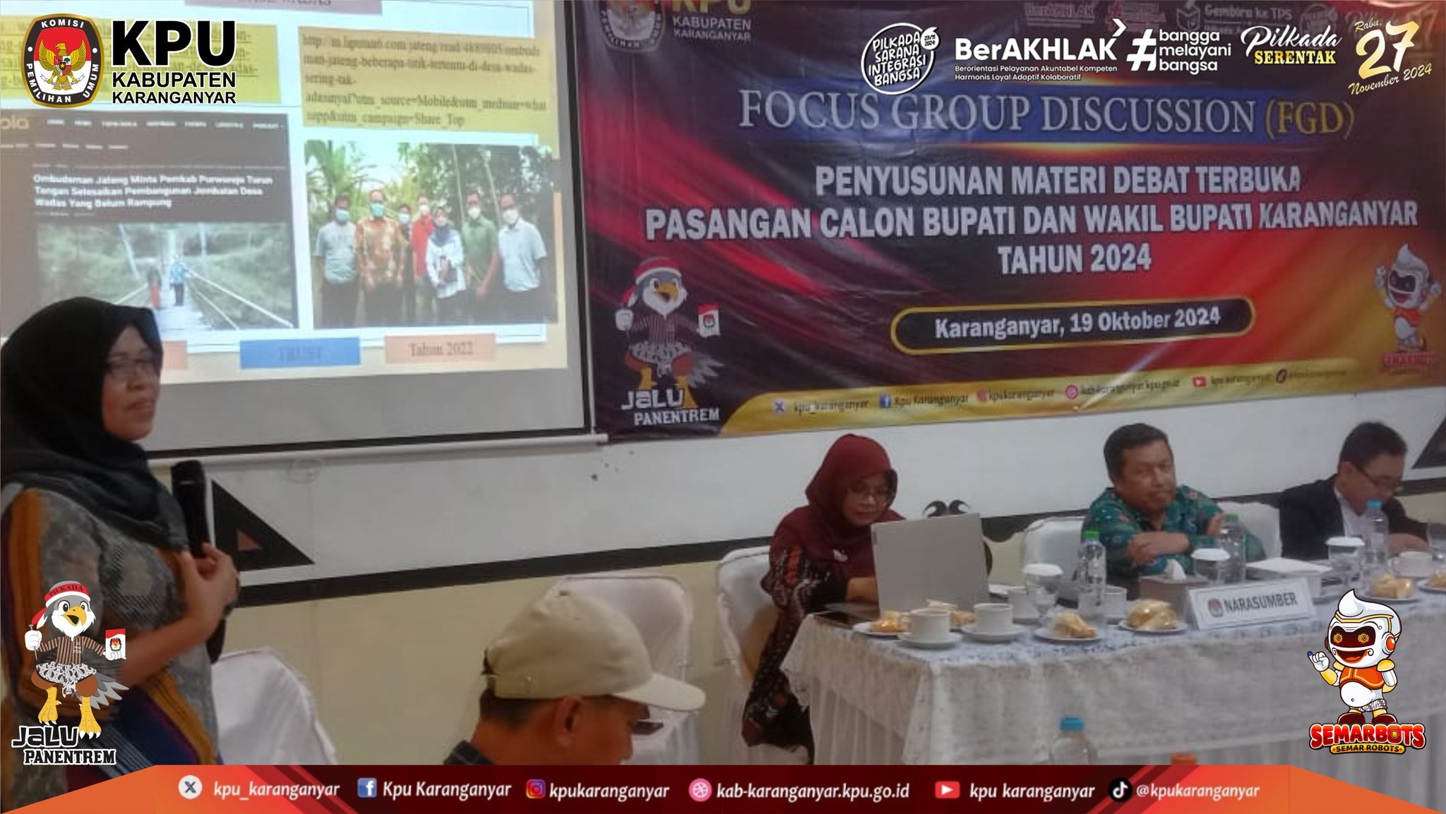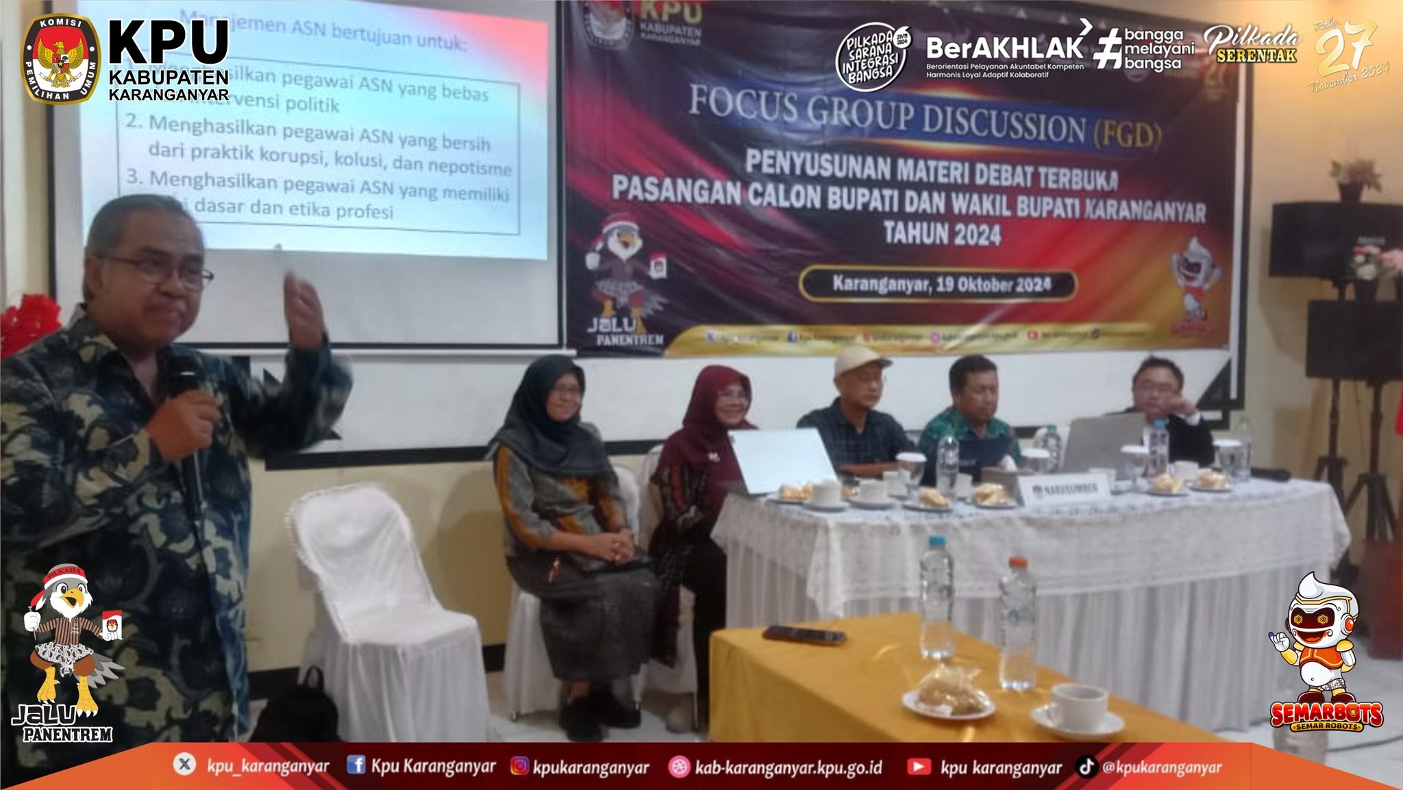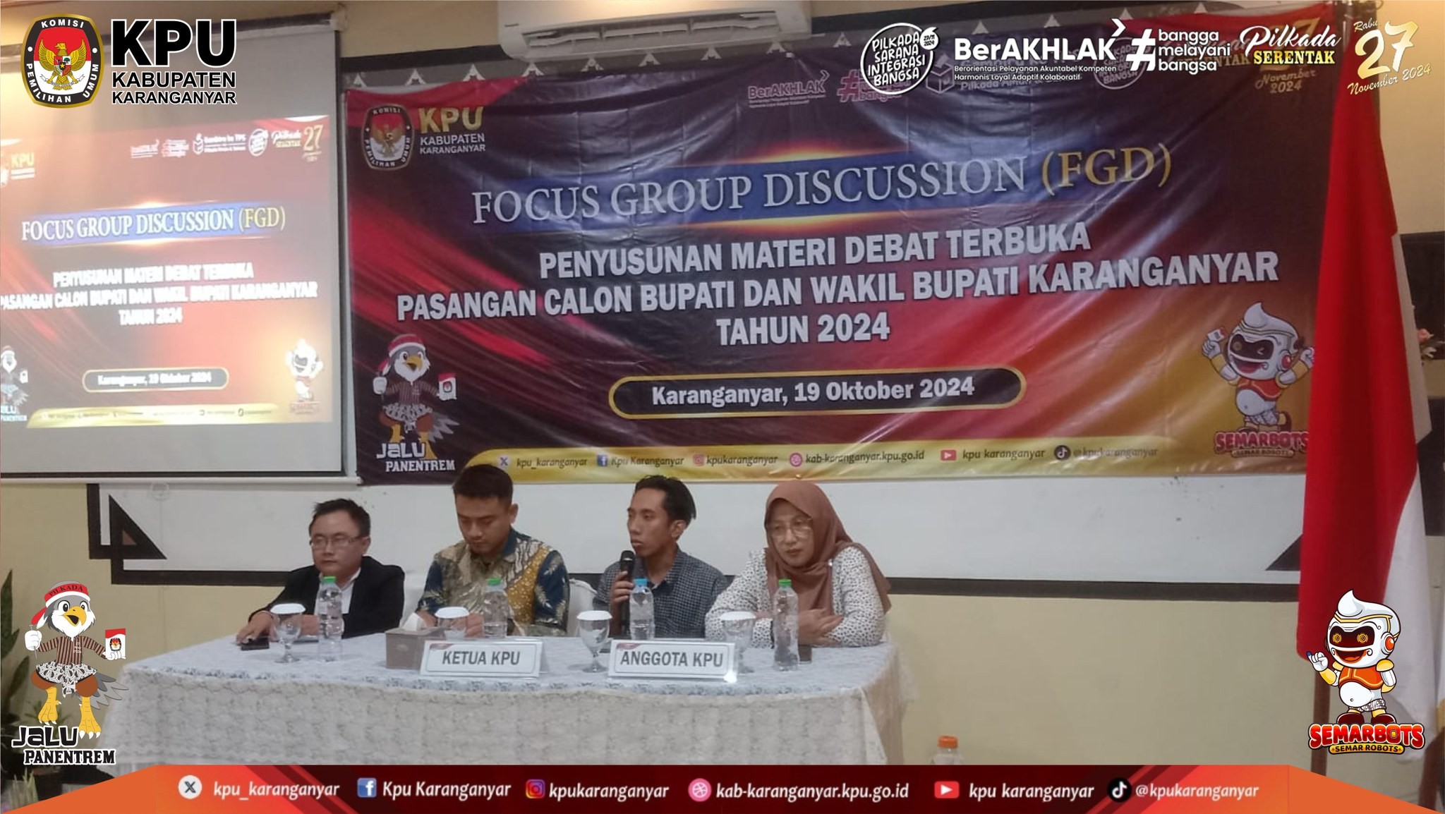 KPU Kabupaten Karanganyar Mengadakan Focus Group Discussion (FGD) Penyusunan Materi Debat Terbuka Pemilihan Bupati dan Wakil Bupati Karanganyar Tahun 2024, Sabtu (19 Oktober 2024)