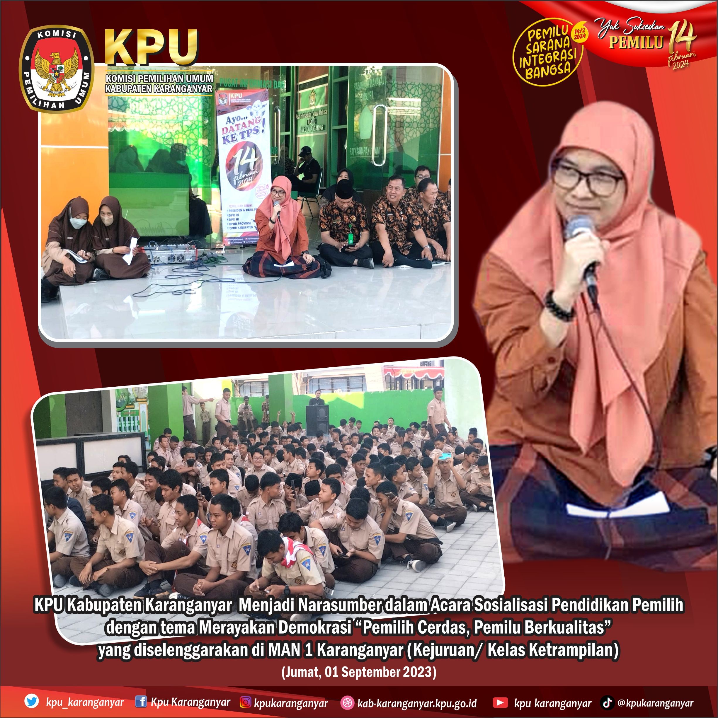 KPU Kabupaten Karanganyar Menjadi Narasumber dalam Acara Sosialisasi Pendidikan Pemilih dengan tema materi Merayakan Demokrasi "Pemilih Cerdas, Pemilu Berkualitas" di MAN 1 Karanganyar (Kejuruan/Kelas Ketrampilan). Kegiatan tersebut dalam rangka Pembelajaran P5 (Project Penguatan Profil Pelajaran Pancasila) dalam rangka implementasi kurikulum merdeka dan juga mengenalkan pendidikan pemilih bagi pemula di MAN 1 Karanganyar (Kejuruan/Kelas Ketrampilan).
