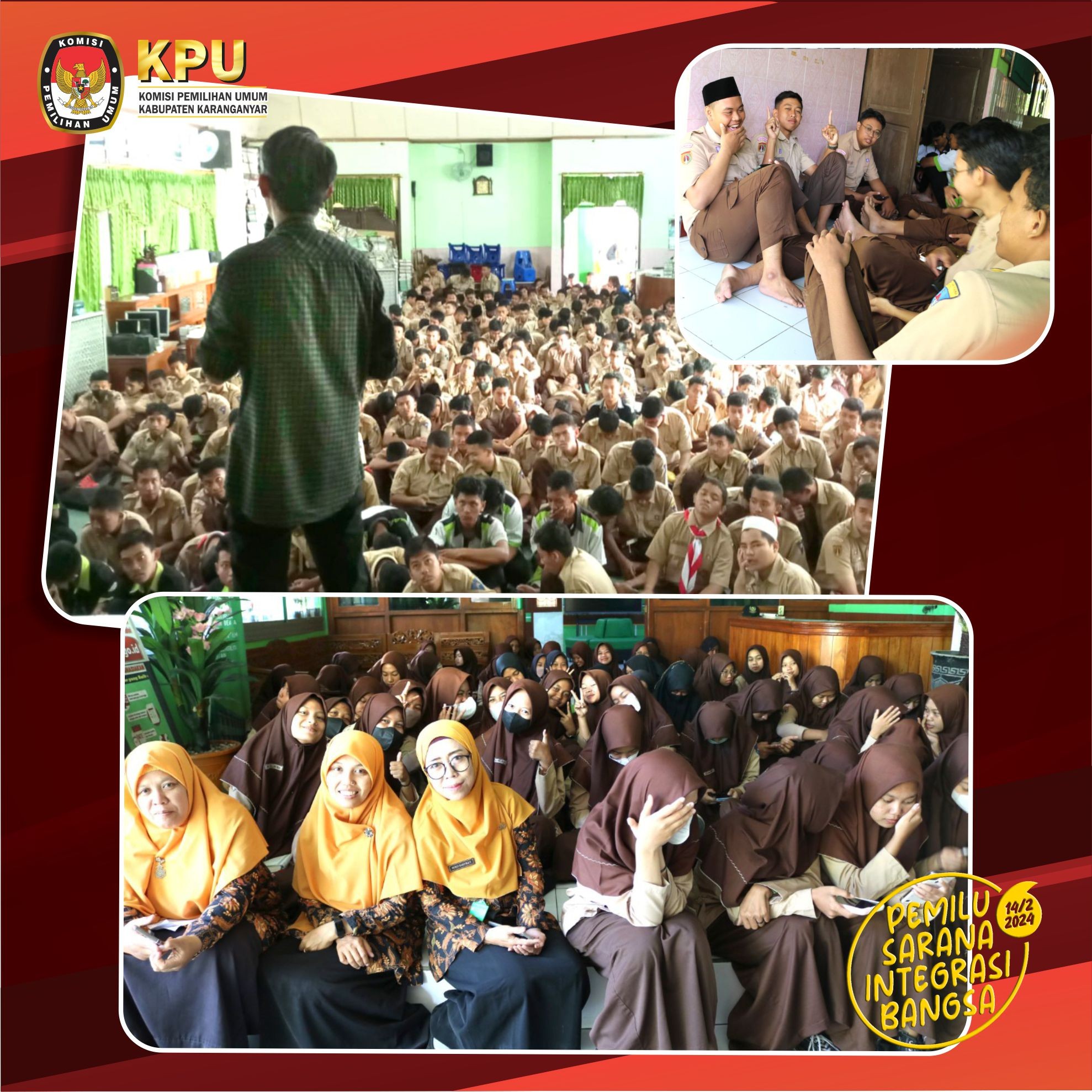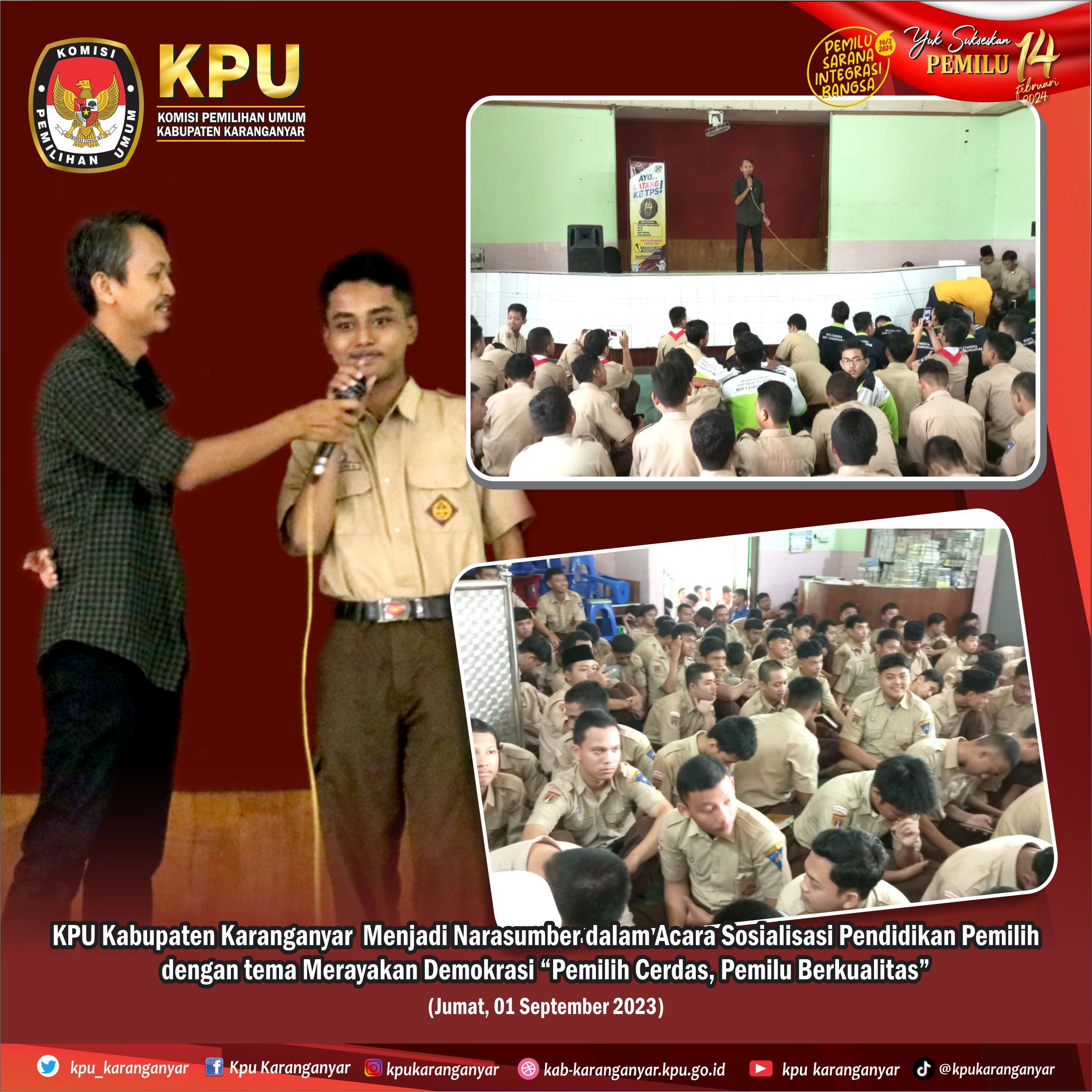 KPU Kabupaten Karanganyar Menjadi Narasumber dalam Acara Sosialisasi Pendidikan Pemilih dengan tema materi Merayakan Demokrasi "Pemilih Cerdas, Pemilu Berkualitas" di MAN 1 Karanganyar. Kegiatan tersebut dalam rangka Pembelajaran P5 (Project Penguatan Profil Pelajaran Pancasila) dalam rangka implementasi kurikulum merdeka dan juga mengenalkan pendidikan pemilih bagi pemula di MAN 1 Karanganyar.