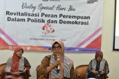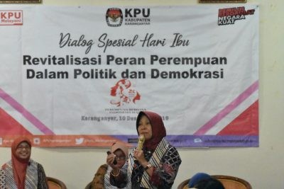 Dialog Spesial Hari Ibu merupakan wujud Sosialisasi KPU Kabupaten Karanganyar dalam melaksanakan Pendidikan Pemilih Perempuan di Wilayah Karanganyar. Acara yang digelar oleh KPU Kabupaten Karanganyar menghadirkan 2 (dua) orang Narasumber yaitu Anggota KPU Provinsi Jawa Tengah, Divisi SDM dan Partisipasi Masyarakat, Diana Ariyanti, dengan materi “Keterwakilan Perempuan dalam Pemilu” serta Dekan Fisip Universitas Sebelas Maret Surakarta (UNS), Prof. Dr. Hj. Ismi Dwi Astuti N., M.Si., dengan Materi “Perempuan dan Kebijakan Publik”.