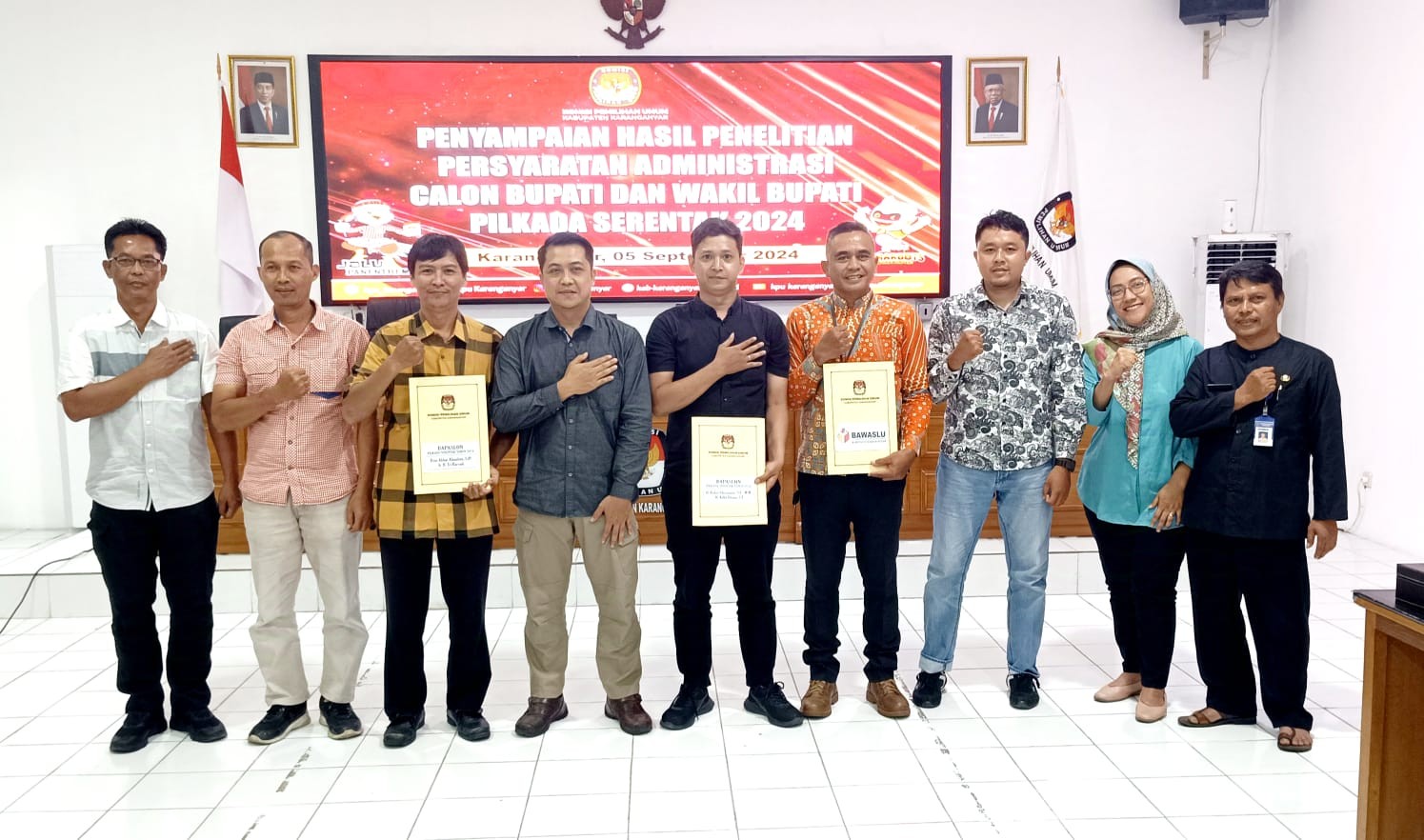 KARANGANYAR – Komisi Pemilihan Umum (KPU) Kabupaten Karanganyar menyerahkan hasil penelitian persyaratan administrasi calon Bupati dan Wakil Bupati pada Pemilihan Serentak Tahun 2024 kepada Bakal Pasangan Calon (Bapaslon) dan Bawaslu.