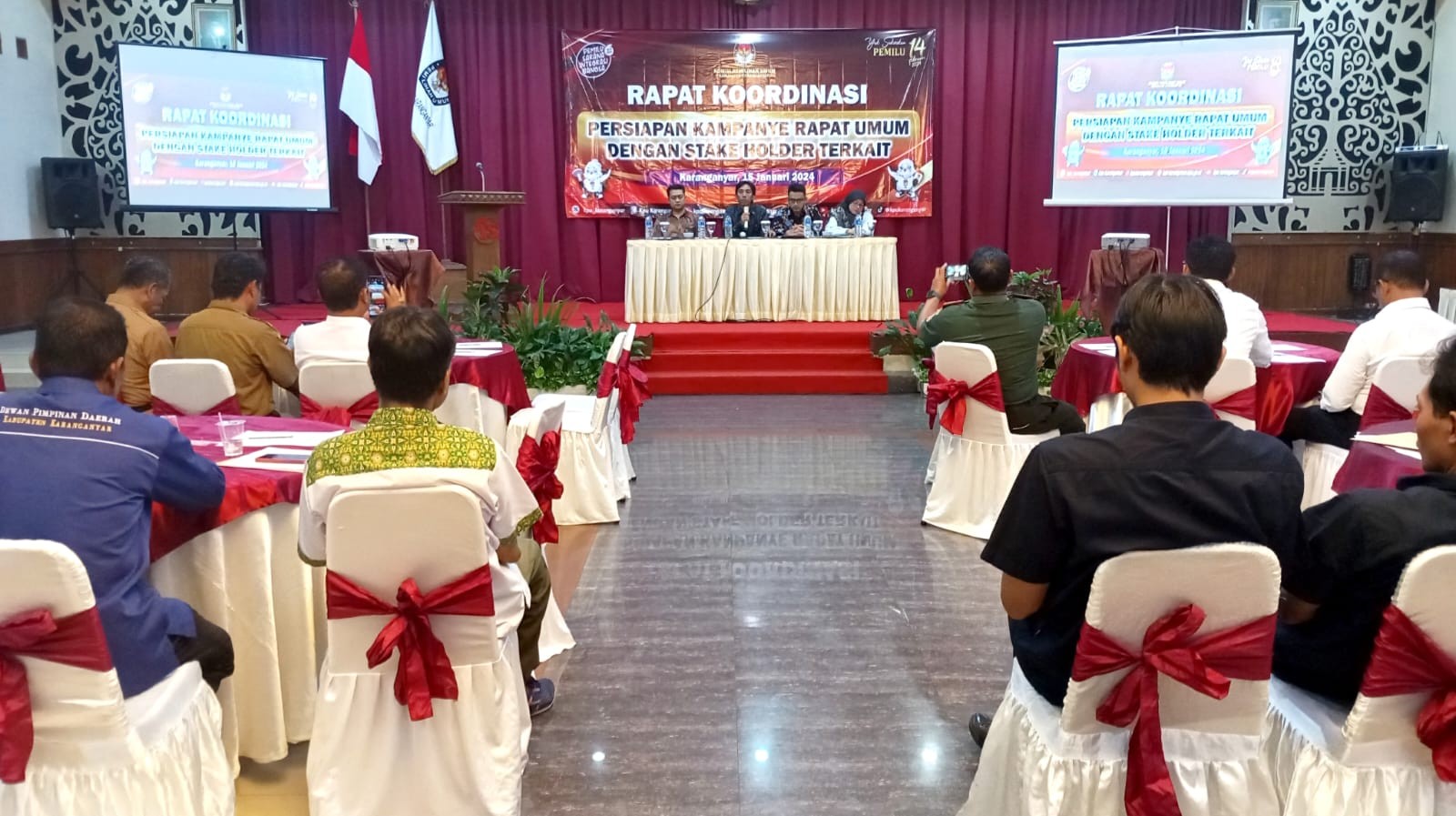 KARANGANYAR - Komisi Pemilihan Umum (KPU) Kabupaten Karanganyar menyiapkan jadwal dan lokasi kampanye rapat umum Pemilu 2024 di Kabupaten Karanganyar. Dengan mengundang stakeholder terkait, KPU menggelar Rapat Koordinasi Persiapan Kampanye Rapat Umum, Senin (15/1/2024) di Hotel Taman Sari. Stakeholder yang terkait diantaranya Partai Politik, Tim Pemenangan Calon Presiden dan Wakil Presiden, Polres, Kodim, Kesbangpol, Dispermasdes, Dishub, Satpol PP, Bagian Pemerintahan dan Bawaslu Kabupaten Karanganyar.