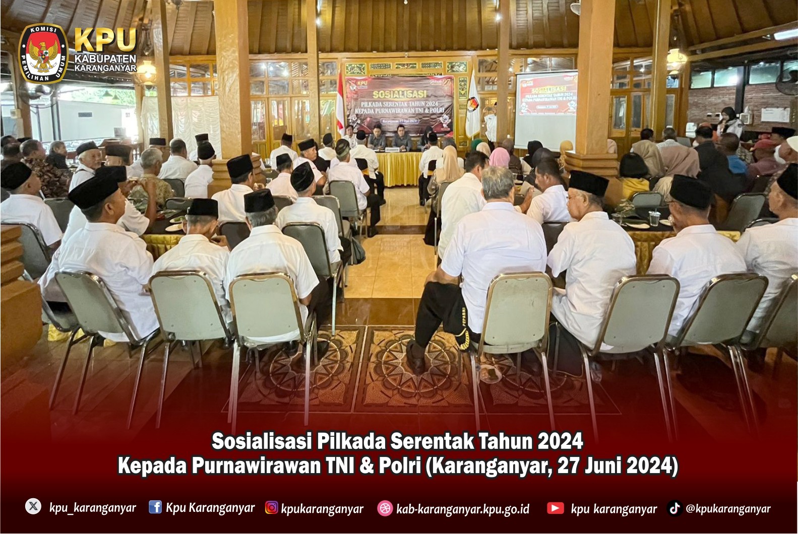 KPU Kabupaten Karanganyar menyelenggarakan kegiatan Sosialisasi Pilkada Serentak Tahun 2024 Kepada Purnawirawan TNI & Polri pada Kamis (27/06/2024) bertempat di SFA Resto Karanganyar.