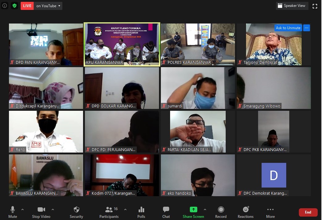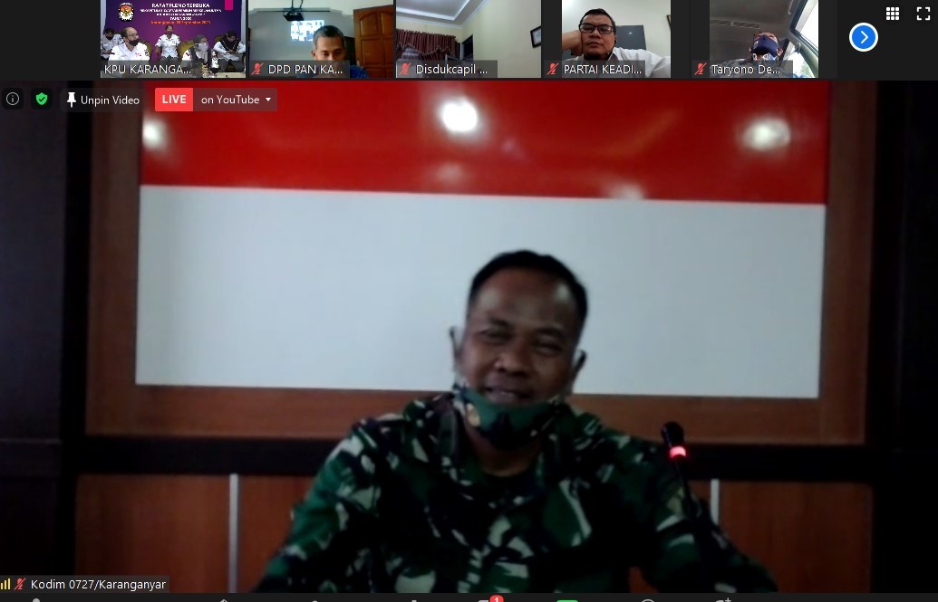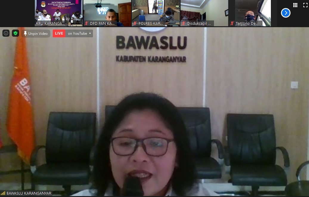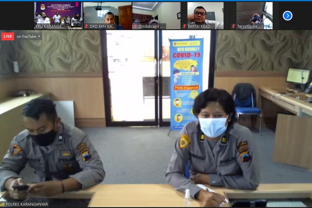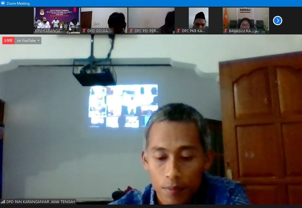 KARANGANYAR – KPU Kabupaten Karanganyar menetapkan daftar pemilih berkelanjutan (DPB) sebanyak 690.881 pemilih dalam Rapat Pleno Terbuka Daftar Pemilih Berkelanjutan yang digelar secara daring (dalam jaringan-red), Senin (28/09/2020). Rapat pleno dilaksanakan melalui aplikasi zoom meeting yang melibatkan Polres Karanganyar, Kodim 0727 Karanganyar, Dinas Kependudukan dan Catatan Sipil Kabupaten Karanganyar, Badan Pengawas Pemilu Kabupaten Karanganyar dan Partai Politik tingkat Kabupaten Karanganyar.