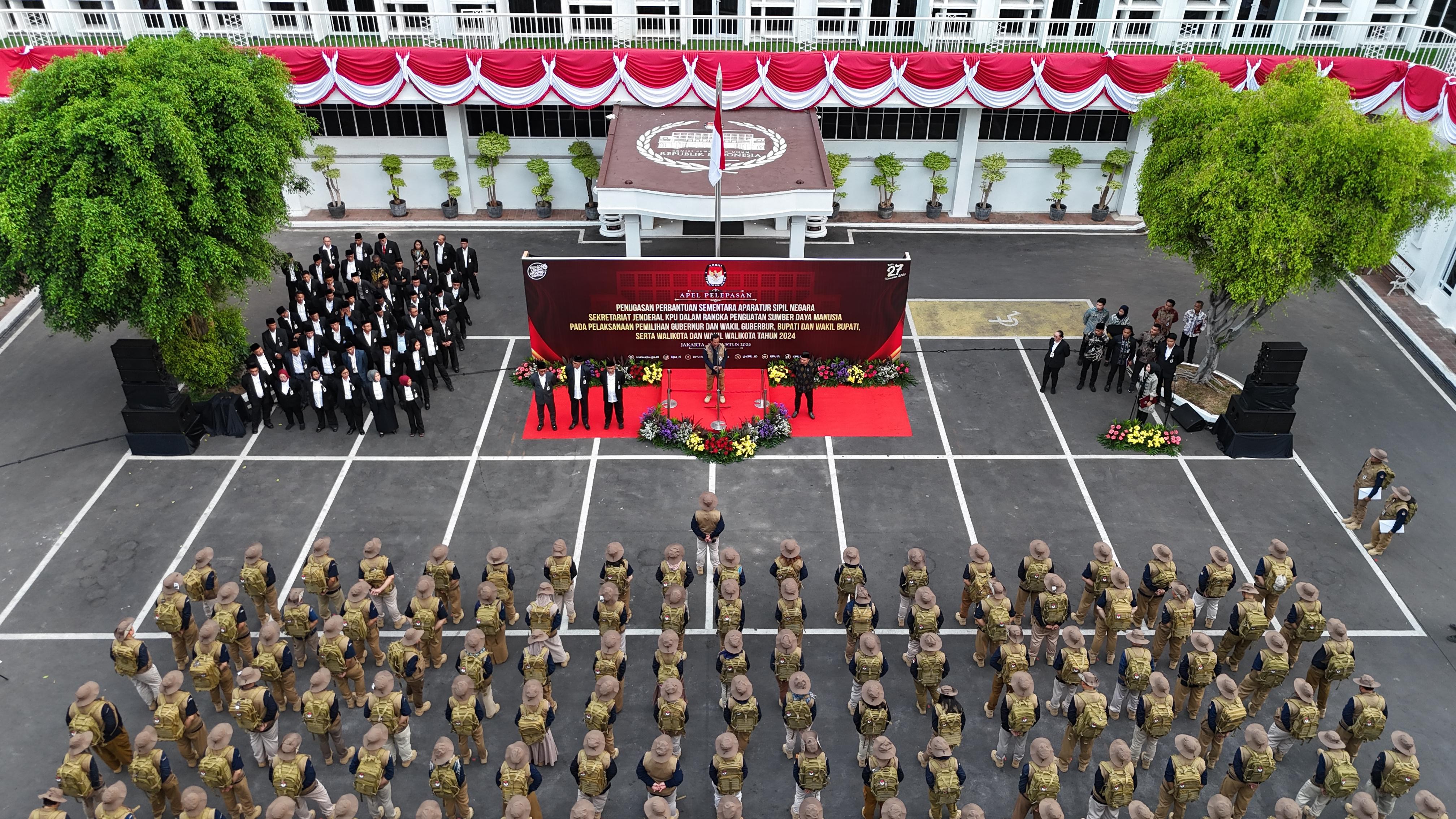 Jakarta, kpu.go.id- Sekretaris Jenderal KPU Bernad Dermawan Sutrisno memimpin Apel Pelepasan Penugasan Perbantuan Sementara Aparatur Sipil Negara Sekretariat Jenderal KPU dalam rangka Penguatan Sumber Daya Manusia pada Pelaksanaan Pemilihan Gubernur dan Wakil Gubernur, Bupati dan Wakil Bupati, serta Walikota dan Wakil Walikota Tahun 2024, di halaman kantor KPU, Jumat (30/8/2024). Turut hadir mengikuti apel, Ketua KPU Mochammad Afifuddin.