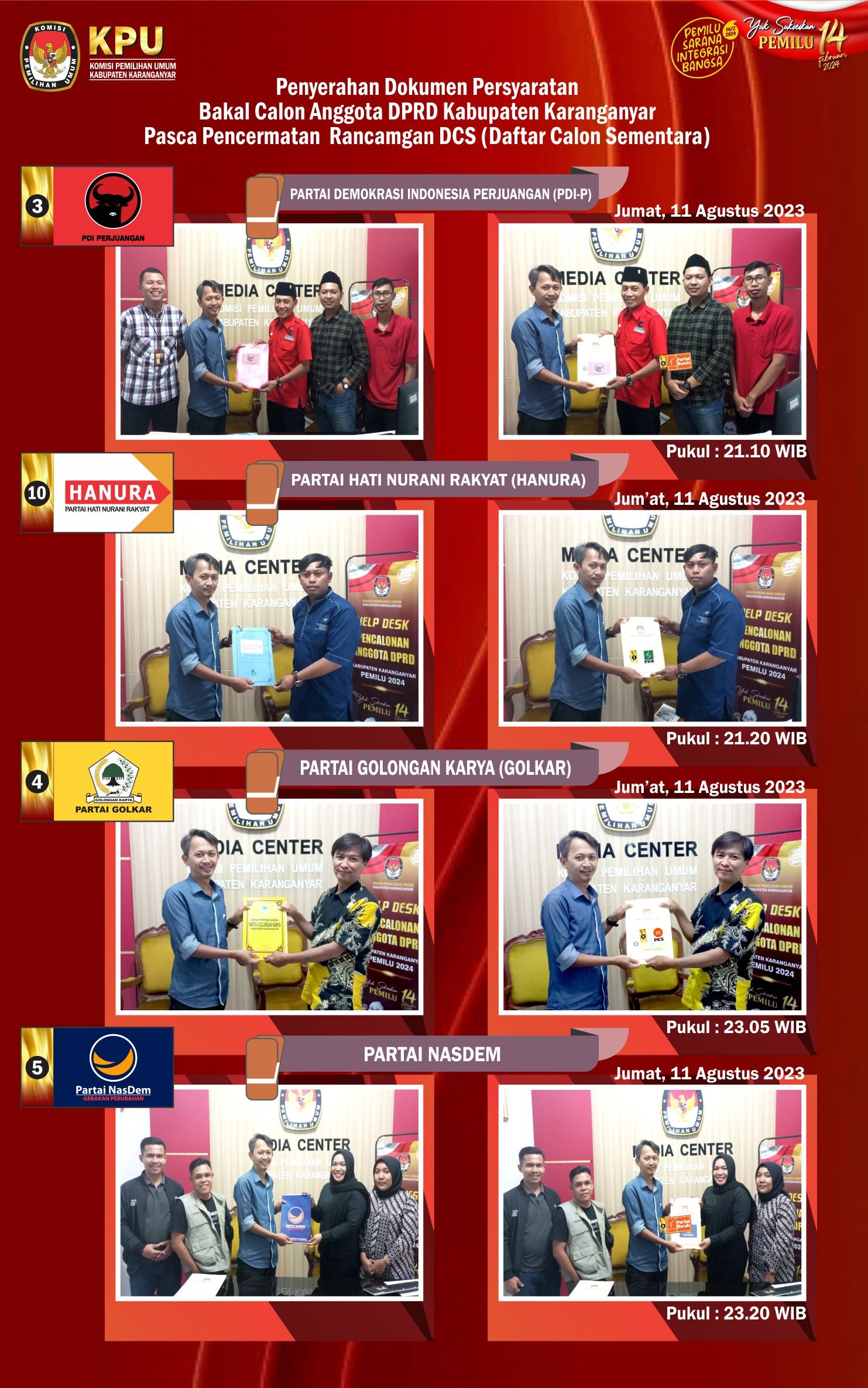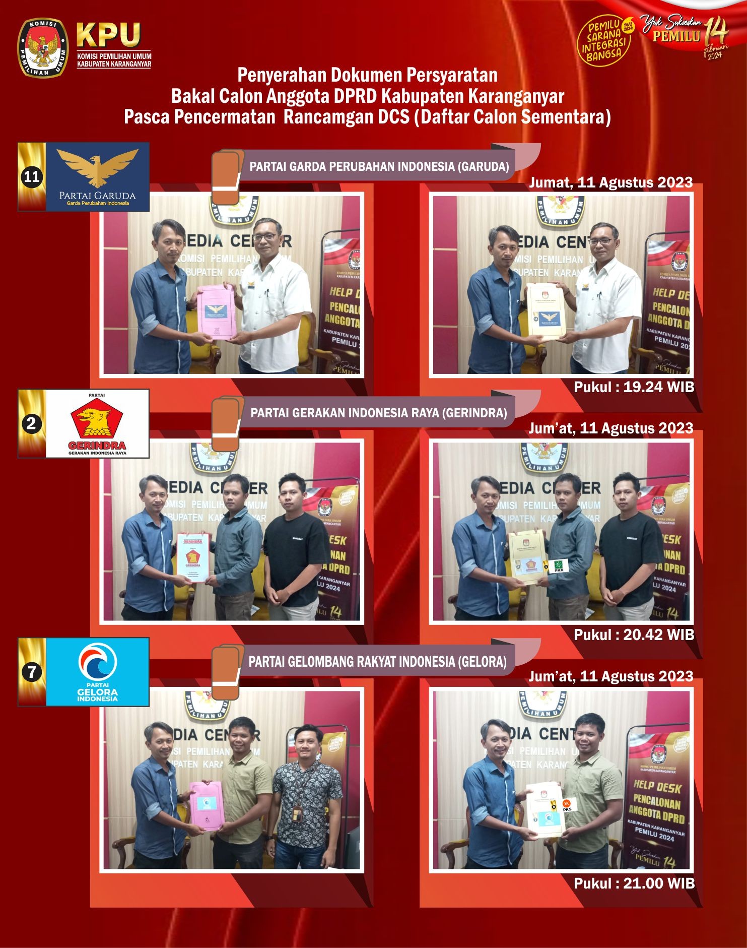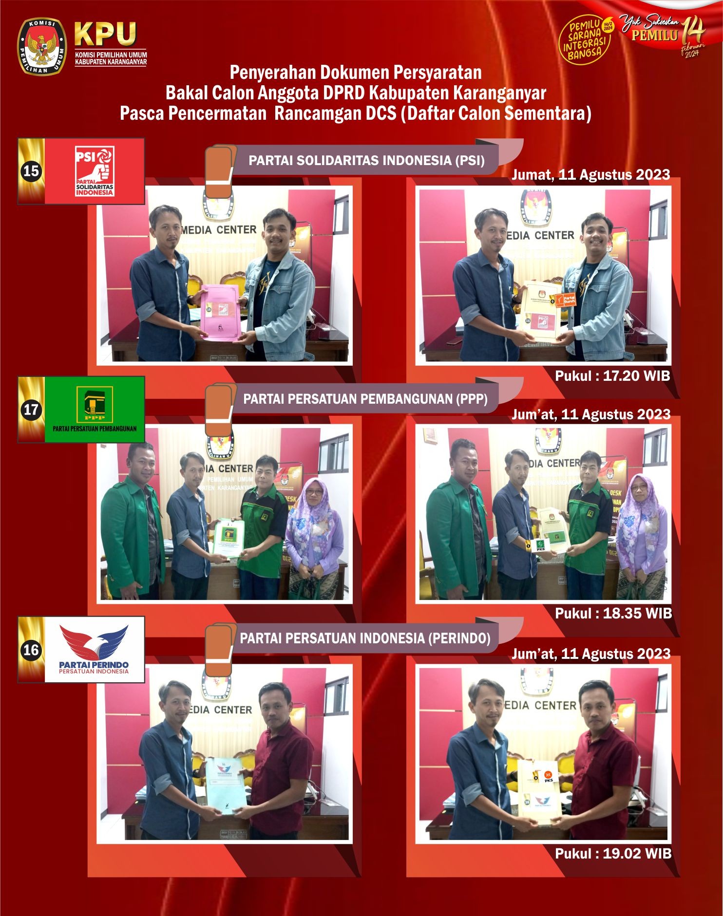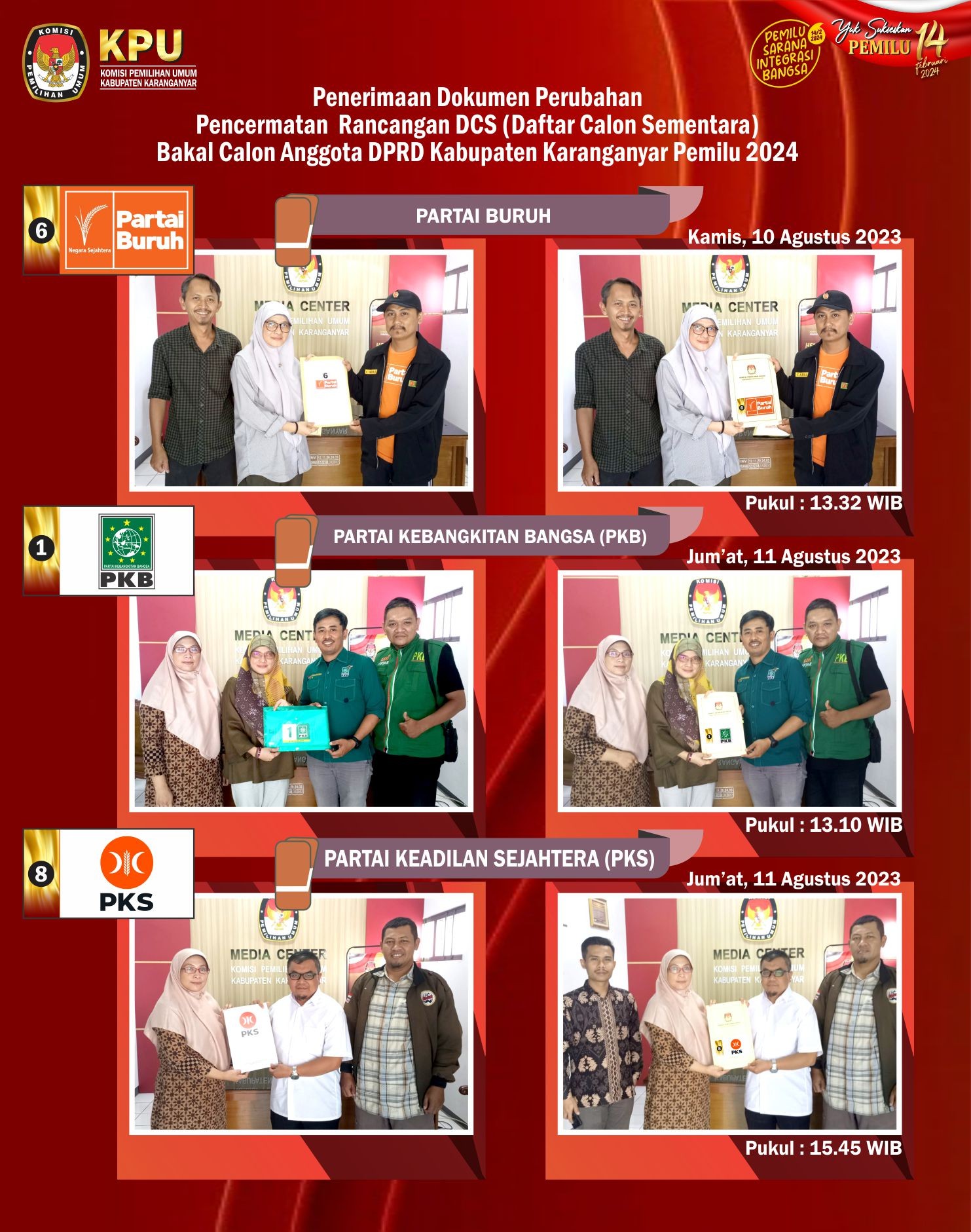 Komisi Pemilihan Umum (KPU) Kabupaten Karanganyar menerima perbaikan data dari partai politik pada masa pencermatan Daftar Caleg Sementara (DCS). Sebanyak 13 dari 18 partai sudah memberikan perbaikan tersebut sejak 6 Agustus 2023 hingga berakhir pada Jumat, 11 Agustus 2023 pukul 23.59 WIB.