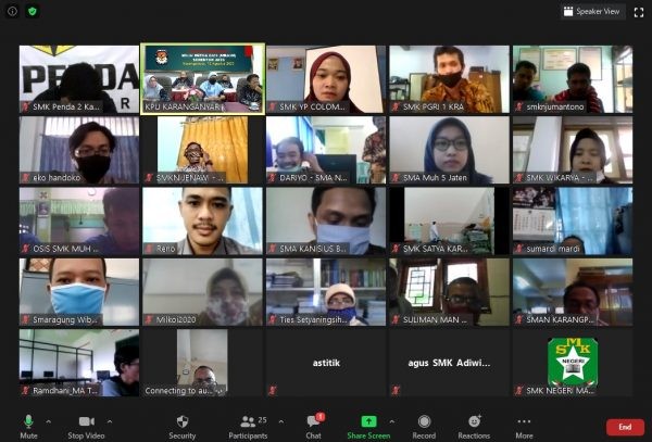 Pendampingan ke SMA/SMK/MA menjadi sarana KPU Karanganyar dalam melakukan Pendidikan pemilih bagi pemilih pemula. KPU Kabupaten Karanganyar bekerjasama dengan Kementerian Agama Kabupaten Karanganyar dan Cabang Dinas Pendidikan Wilayah VI Dinas Pendidikan dan Kebudayaan Provinsi Jawa Tengah menggagas Pemilihan Ketua Organisasi Siswa Intra Sekolah (OSIS) SMA/SMK/MA se Kabupaten Karanganyar melalui Daring (dalam jaringan-red). Sebagai tindaklanjut tersebut, KPU Kabupaten Karanganyar melakukan koordinasi dengan guru Pembina OSIS SMA/SMK/MA se Kabupaten Karanganyar untuk proses Pemilihan Ketua OSIS (Milkoi 2020), Rabu (12/08/2020).