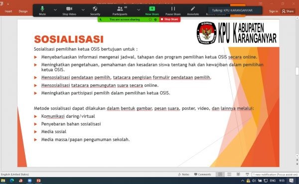 Devid Wahyuningtyas, Anggota KPU Kabupaten Karanganyar Divisi Sosialisasi dan Pendidikan Pemilih, menjelaskan bahwa Pemilihan Ketua OSIS untuk tahun ini agak berbeda dari tahun sebelumnya. “Dikarenakan adanya pandemi Covid-19, semua pembelajaran dan kegiatan kesiswaan dilakukan melalui daring. Termasuk dalam kegiatan Milkoi 2020 ini yang merupakan proses pembinaan kesiswaan sesuai Permendikbud nomor 39 Tahun 2008,” jelas Devid.