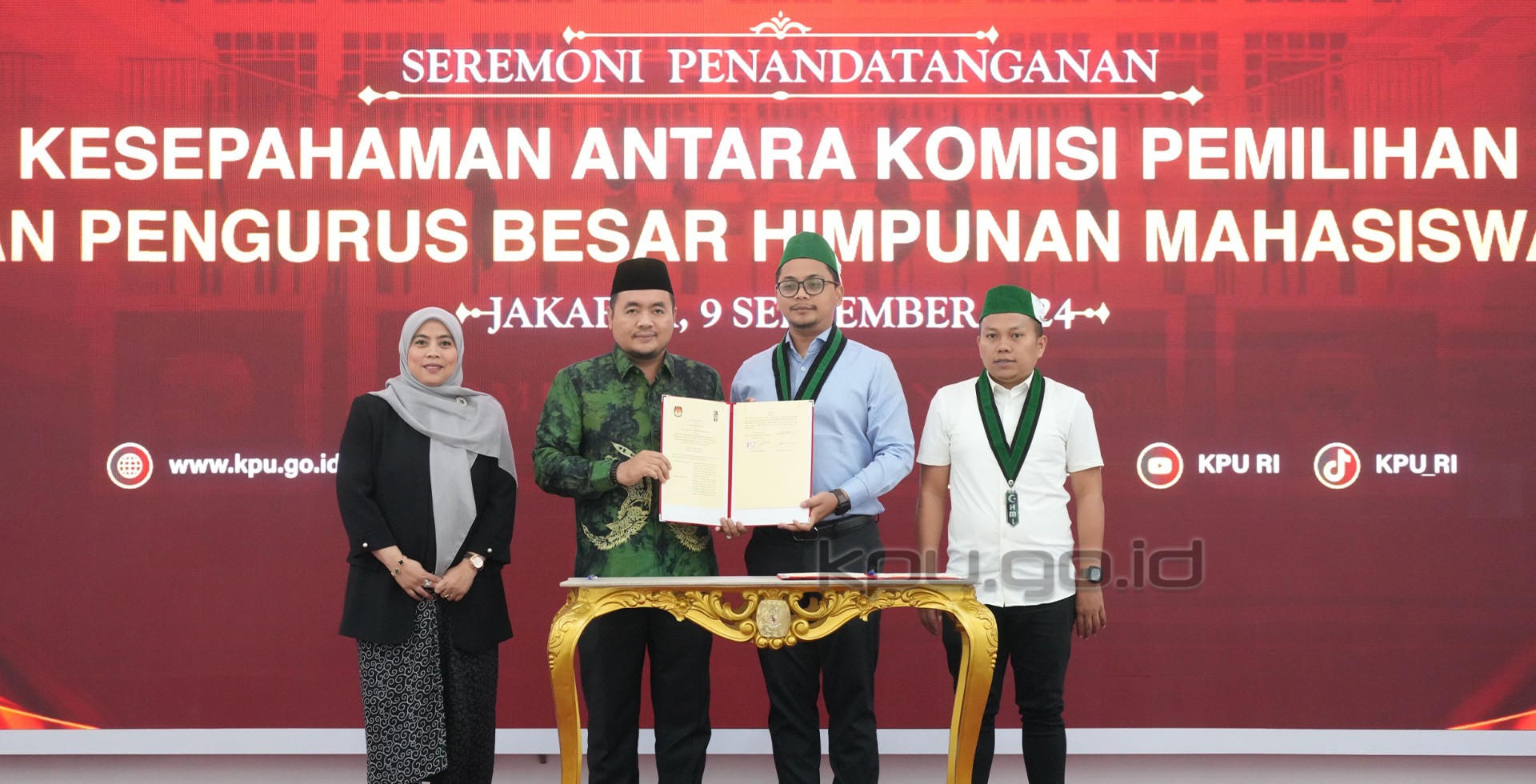 Jakarta, kpu.go.id – Komisi Pemilihan Umum (KPU) bersama Pengurus Besar Himpunan Mahasiswa Islam (PB HMI) menjalin kerjasama yang dituangkan dalam Nota Kesepahaman (Memorandum of Understanding/MoU) yang ditandatangani Ketua KPU Mochammad Afifuddin bersama Ketua Umum PB HMI Bagas Kurniawan, di Ruang Sidang Utama Gedung KPU, Senin (9/9/2024).