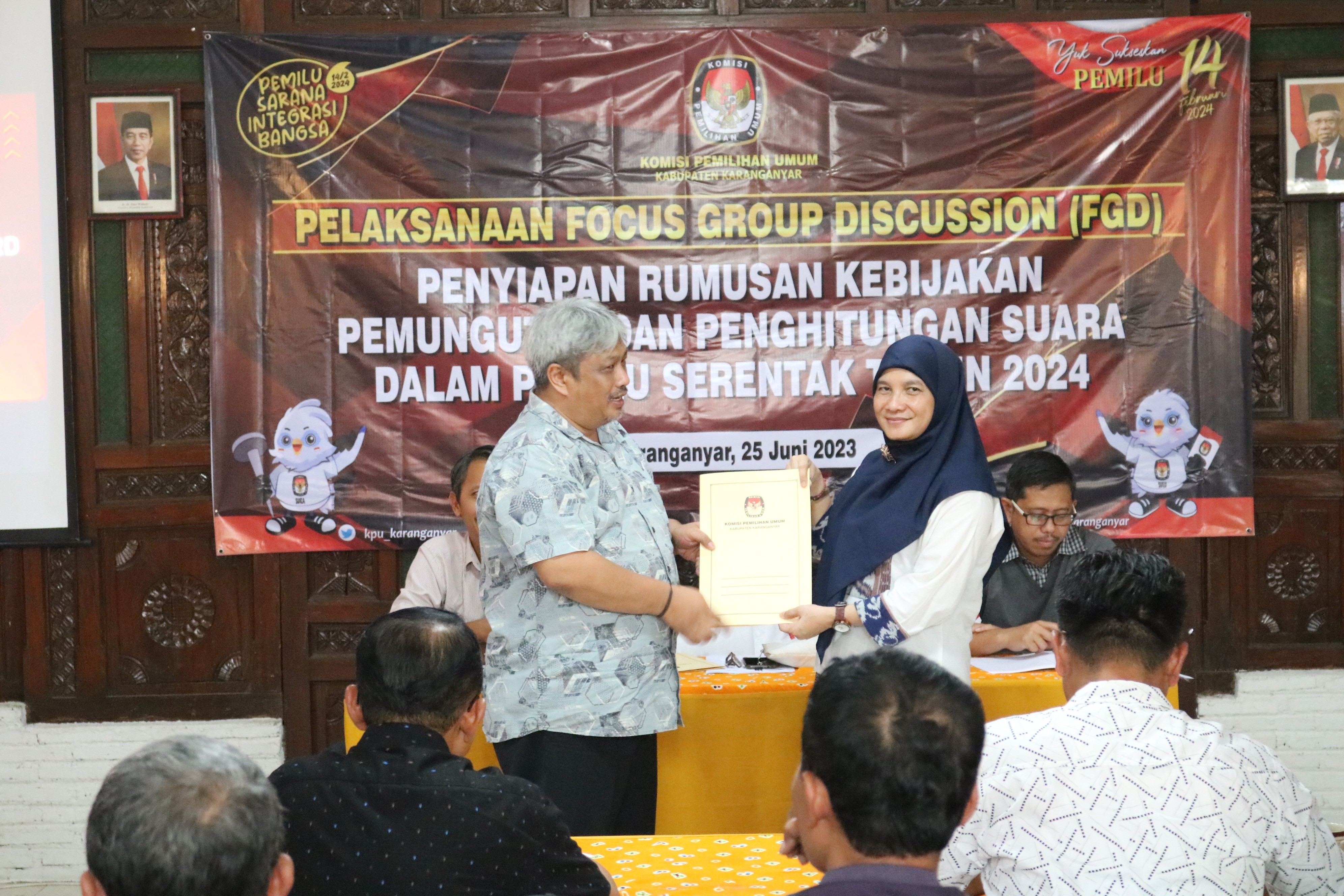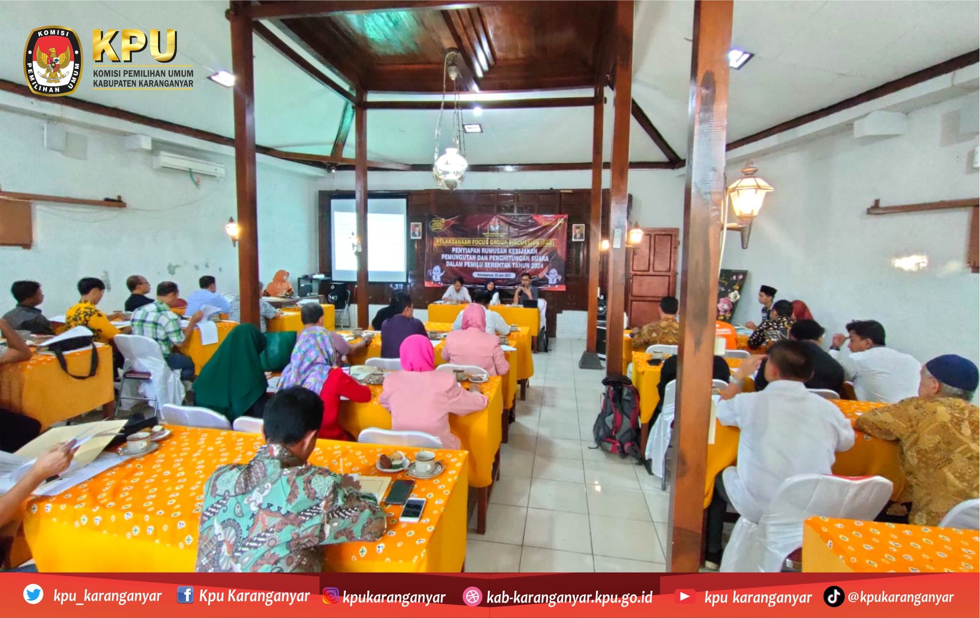 KPU Kabupaten Karanganyar menjadi penyelenggara Pelaksanaan Focus Group Discussion (FGD) Penyiapan Rumusan Kebijakan Pemungutan dan Penghitungan Suara Dalam Pemilu Serentak Tahun 2024 (Karanganyar, 25 Juni 2023). Turut hadir Bp. Anas Syahirul A., menjadi narasumber dalam acara tersebut.