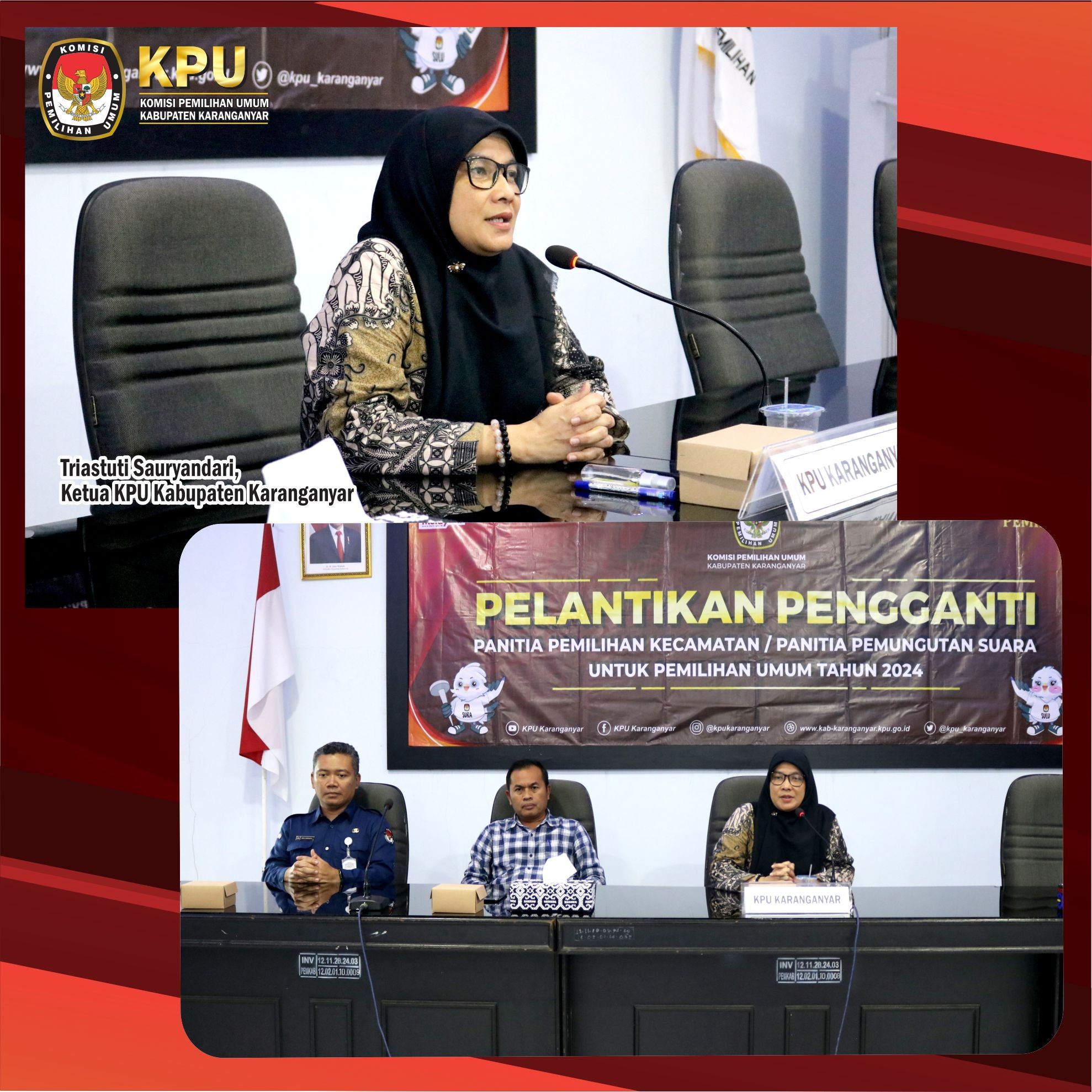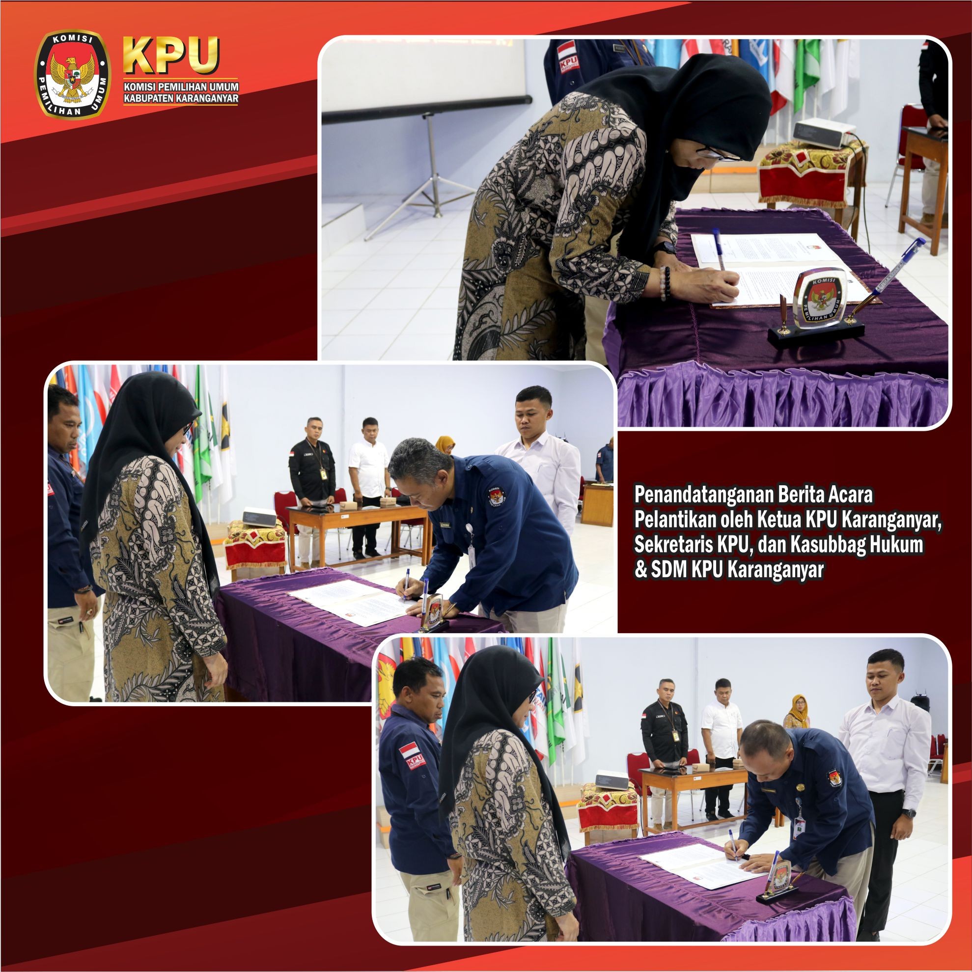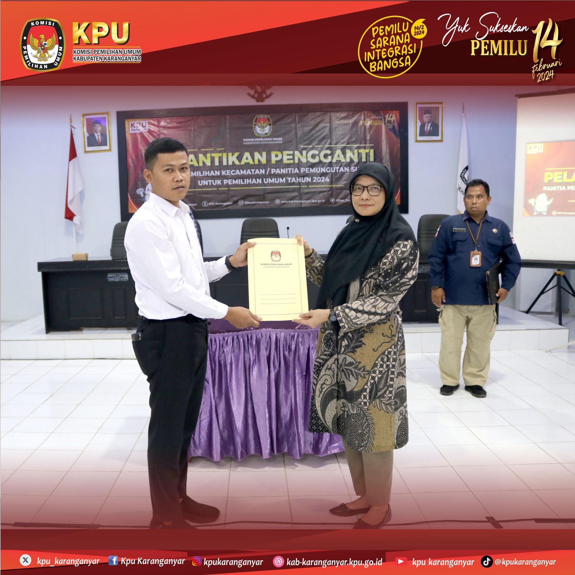 KPU Kabupaten Karanganyar menyelenggarakan Pelantikan dan Pengambilan Sumpah Janji Pengganti Panitia Pemungutan Suara (PPS) pada Desa Gedong, Kecamatan Karanganyar, Kab.Karanganyar untuk Pemilu 2024 di Aula KPU Karanganyar (Selasa, 12 September 2023).