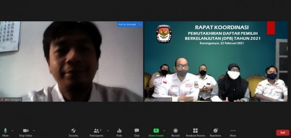 Anggota KPU Karanganyar Divisi Perencanaan, Data dan Informasi, Kustiyono menyampaikan bahwa pemutakhiran DPB diawali dengan rapat koordinasi ekternal. “Koordinasi eksternal bisa mengundang pemangku kepentingan/stakeholder antara lain Disdukcapil, TNI, Polri, Pengadilan Negeri, dan Bawaslu. Pelaksanaan Rakor dilakukan secara daring karena masih menjalani Pemberlakuan Pembatasan Kegiatan Masyarakat (PPKM) Mikro,” papar Kustiyono.
