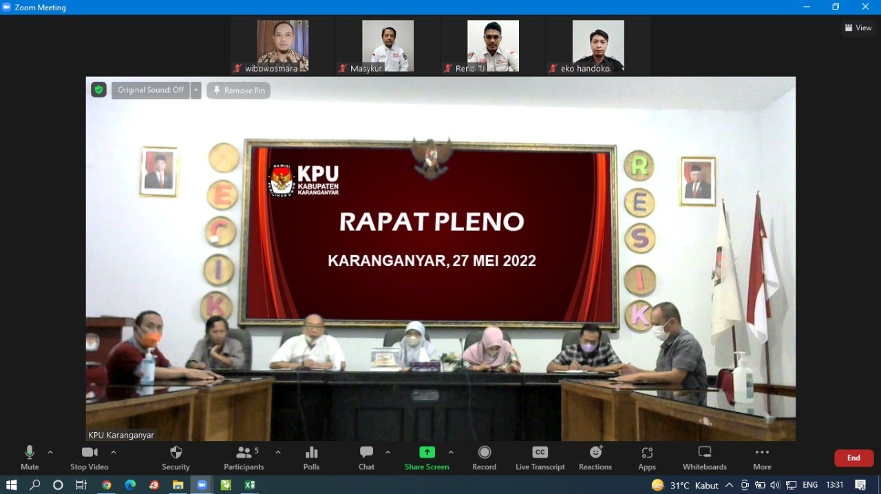 KARANGANYAR – Pemutakhiran Data Pemilih Berkelanjutan (DPB) Bulan Mei 2022, KPU Karanganyar mencatat ada 185 pemilih memenuhi syarat (MS). Hal tersebut disampaikan dalam rapat Pleno Rekapitulasi Daftar Pemilih Berkelanjutan Bulan Mei 2022, Jumat (27/05/2022), yang dipimpin oleh Ketua KPU Karanganyar Triastuti Suryandari. Rapat dilaksanakan secara daring dan luring di aula KPU Karanganyar tersebut dihadiri oleh komisioner, sekretaris dan seluruh kasubbag di lingkungan KPU Karanganyar.