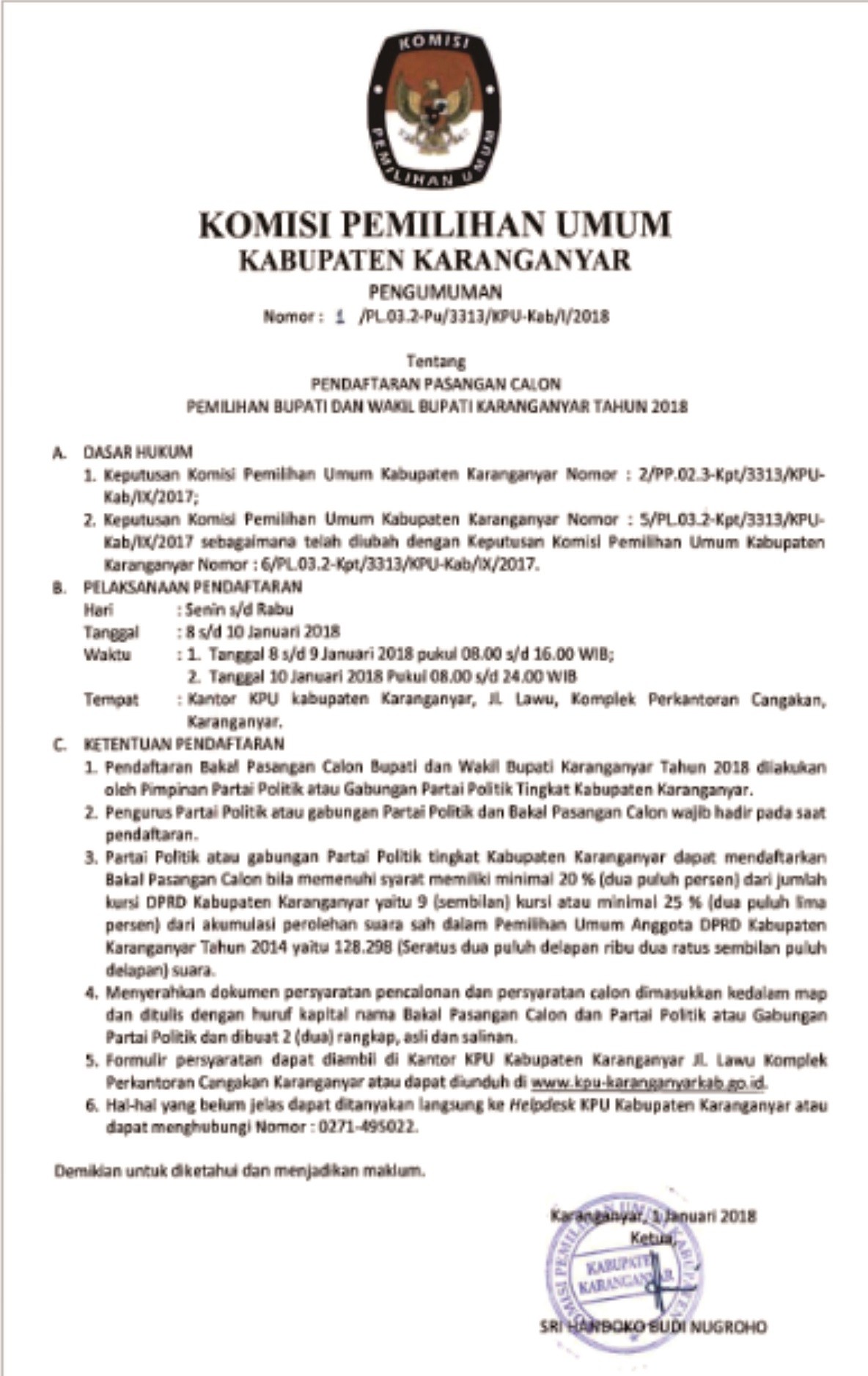 Pendaftaran Pasangan Calon Pemilihan BUPATI dan Wakil BUPATI Karanganyar Tahun 2018 Senin, 01 Januari 2018 00:00 35 DOWNLOAD PENGUMUMAN PENDAFTARAN DOWNLOAD FORMULIR PENDAFTARAN Bagikan: Telah dilihat 35 kali