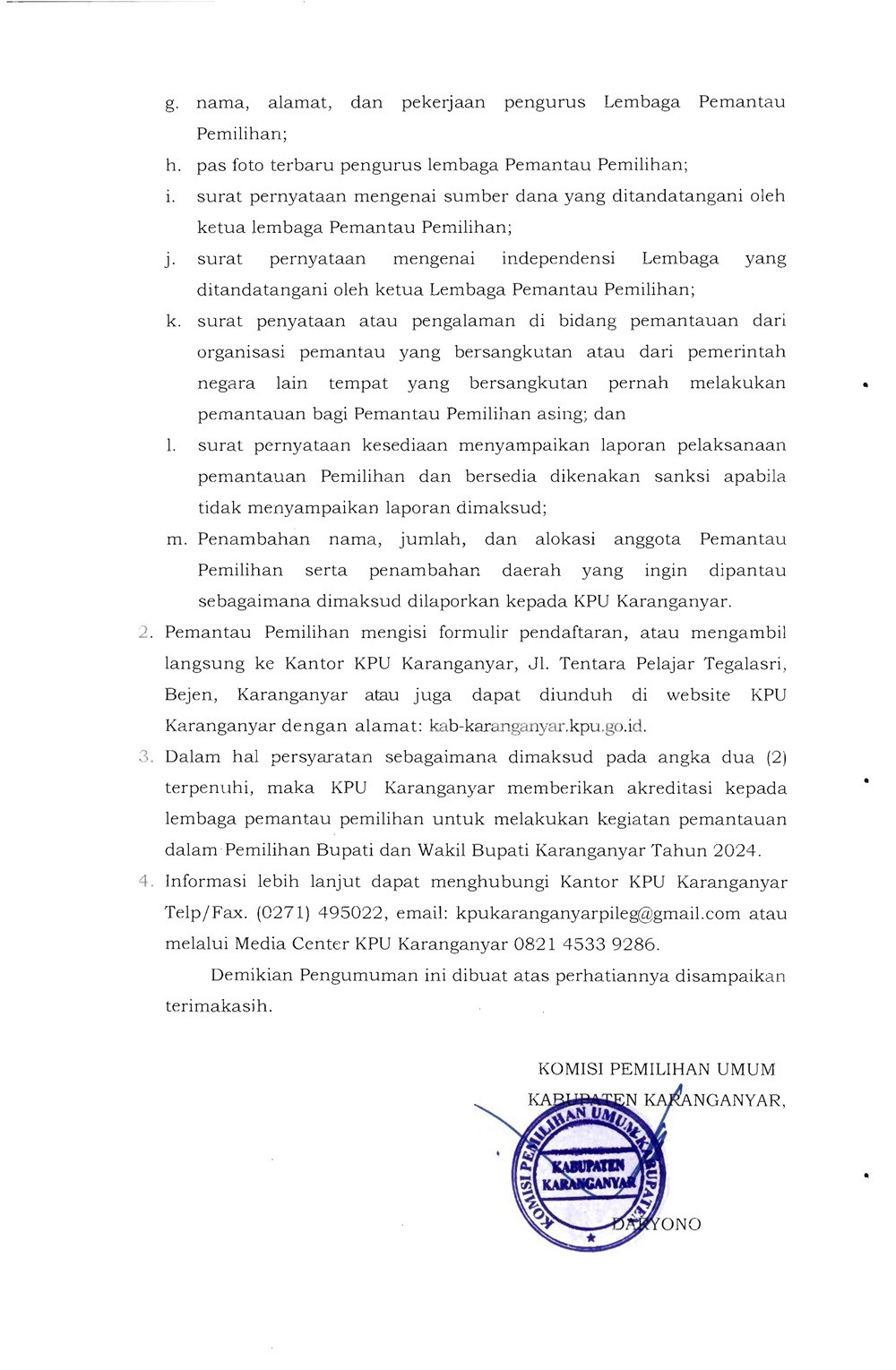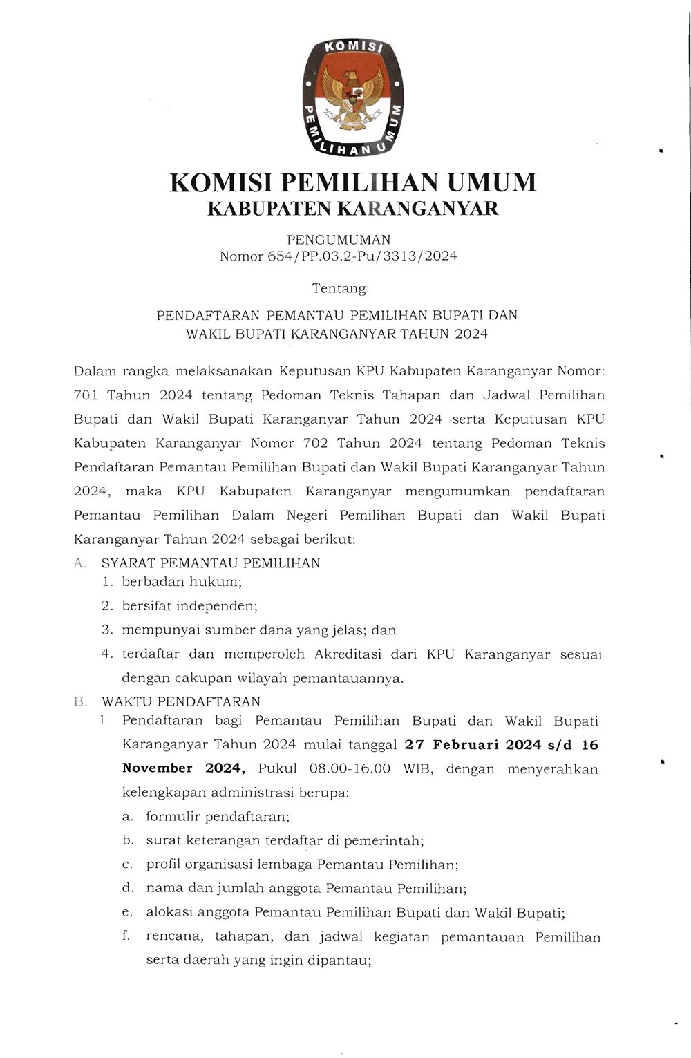 PENDAFTARAN PEMANTAU PEMILIHAN BUPATI DAN WAKIL BUPATI KARANGANYAR TAHUN 2024 Selasa, 27 Februari 2024 15:00 110 DOWNLOAD PENGUMUMAN Bagikan: Telah dilihat 110 kali