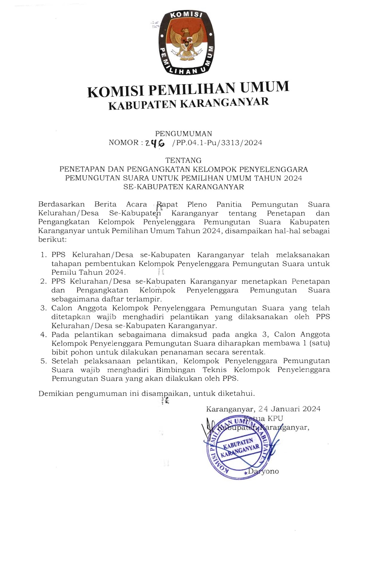 PENETAPAN DAN PENGANGKATAN KELOMPOK PENYELENGGARA PEMUNGUTAN SUARA UNTUK PEMILU TAHUN 2024 SE-KABUPATEN KARANGANYAR Rabu, 24 Januari 2024 12:00 173 DOWNLOAD PENGUMUMAN DOWNLOAD LAMPIRAN Bagikan: Telah dilihat 173 kali