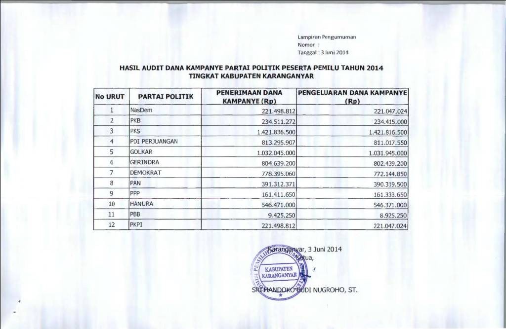 Pengumuman Hasil Audit Laporan Dana Kampanye Parpol