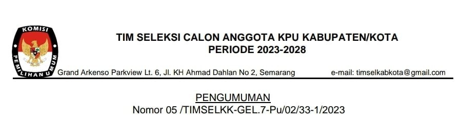 PENGUMUMAN HASIL PENELITIAN ADMINISTRASI BAKAL CALON ANGGOTA KPU KAB/KOTA DI JAWA TENGAH PERIODE 2023-2028 GELOMBANG VII