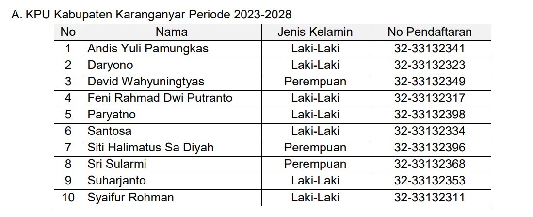 Berdasarkan Berita Acara Tim Seleksi Nomor 13/TIMSELKK-GEL.7-BA/03/33-3/2023 tanggal Tiga Puluh bulan Agustus tahun Dua Ribu Dua Puluh Tiga tentang Penetapan Hasil Tes Tertulis dan Wawancara Bakal Calon Anggota KPU Kabupaten/Kota Jawa Tengah 3 Periode 2023- 2028, nama-nama calon Anggota KPU Kabupaten Karanganyar Jawa Tengah 3 Periode 2023-2028 hasil seleksi sebagai berikut :