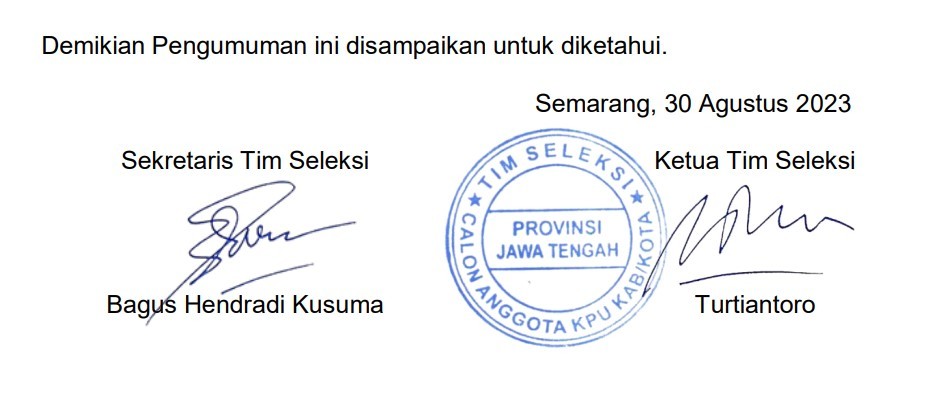 PENGUMUMAN HASIL SELEKSI CALON ANGGOTA KPU KABUPATEN/KOTA PROVINSI JAWA TENGAH PERIODE 2023-2028 GELOMBANG VII