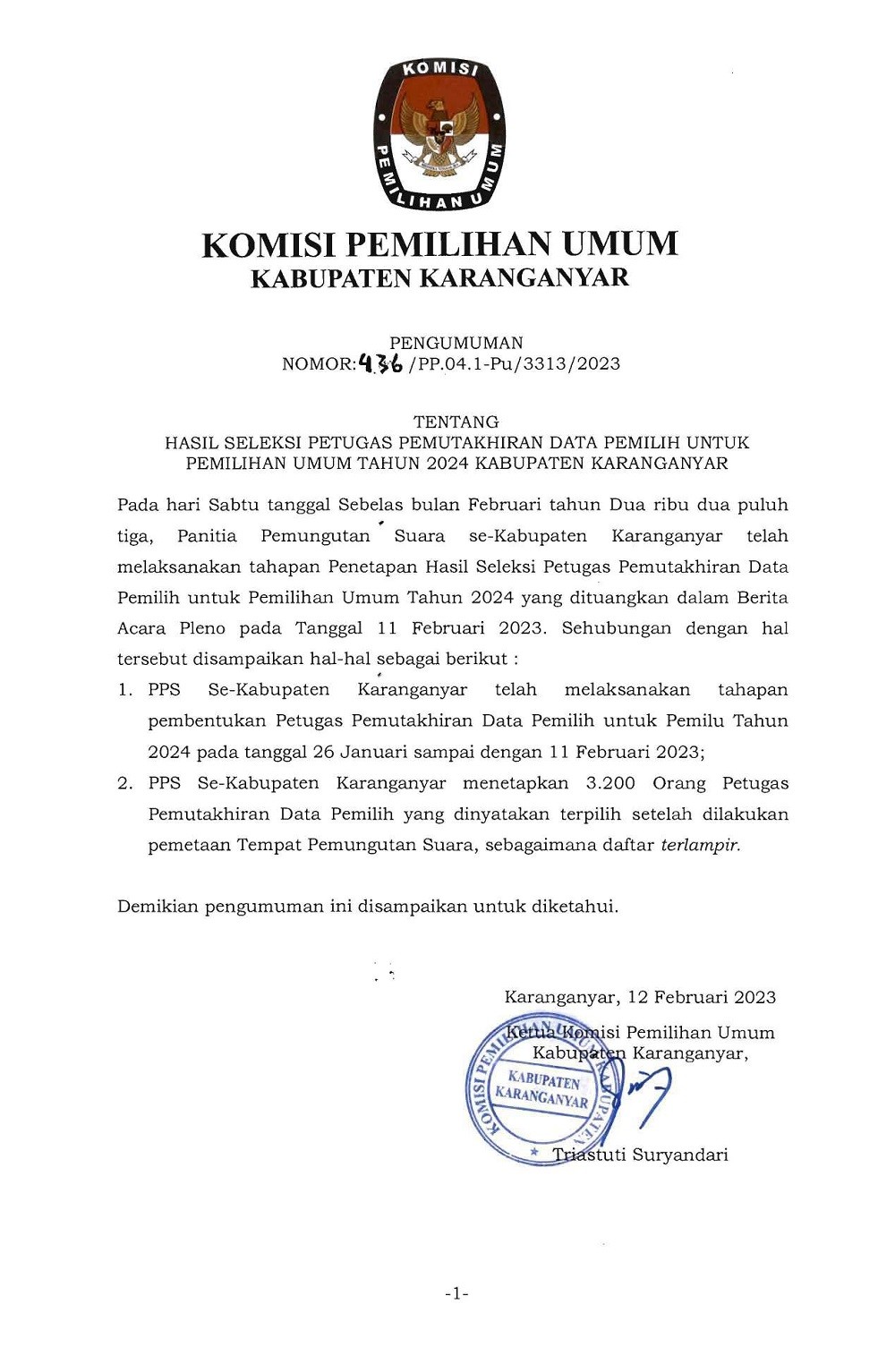 PENGUMUMAN HASIL SELEKSI PANTARLIH UNTUK PEMILU TAHUN 2024 KABUPATEN KARANGANYAR Minggu, 12 Februari 2023 15:12 236 DOWNLOAD PENGUMUMAN Bagikan: Telah dilihat 236 kali