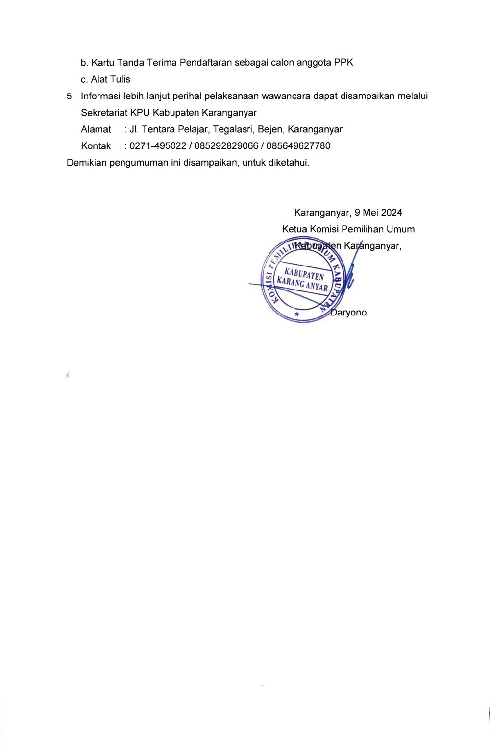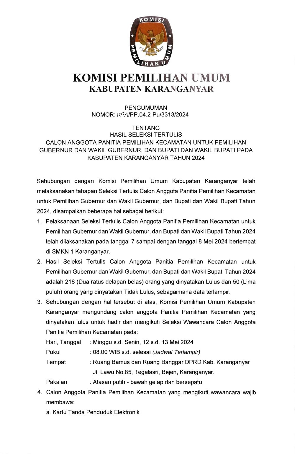 PENGUMUMAN HASIL SELEKSI TERTULIS CALON ANGGOTA PPK UNTUK PEMILIHAN GUBERNUR DAN WAKIL GUBERNUR, DAN BUPATI DAN WAKIL BUPATI PADA KABUPATEN KARANGANYAR TAHUN 2024 Kamis, 09 Mei 2024 11:00 988 DOWNLOAD PENGUMUMAN Bagikan: Telah dilihat 988 kali