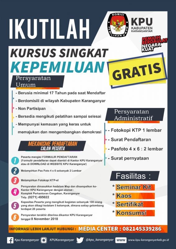 PENGUMUMAN KURSUS SINGKAT KEPEMILUAN (ELECTION SHORTCOURSES) Kamis, 25 Oktober 2018 00:00 35 DOWNLOAD FORMULIR KURSUS SINGKAT KEPEMILUAN Bagikan: Telah dilihat 35 kali