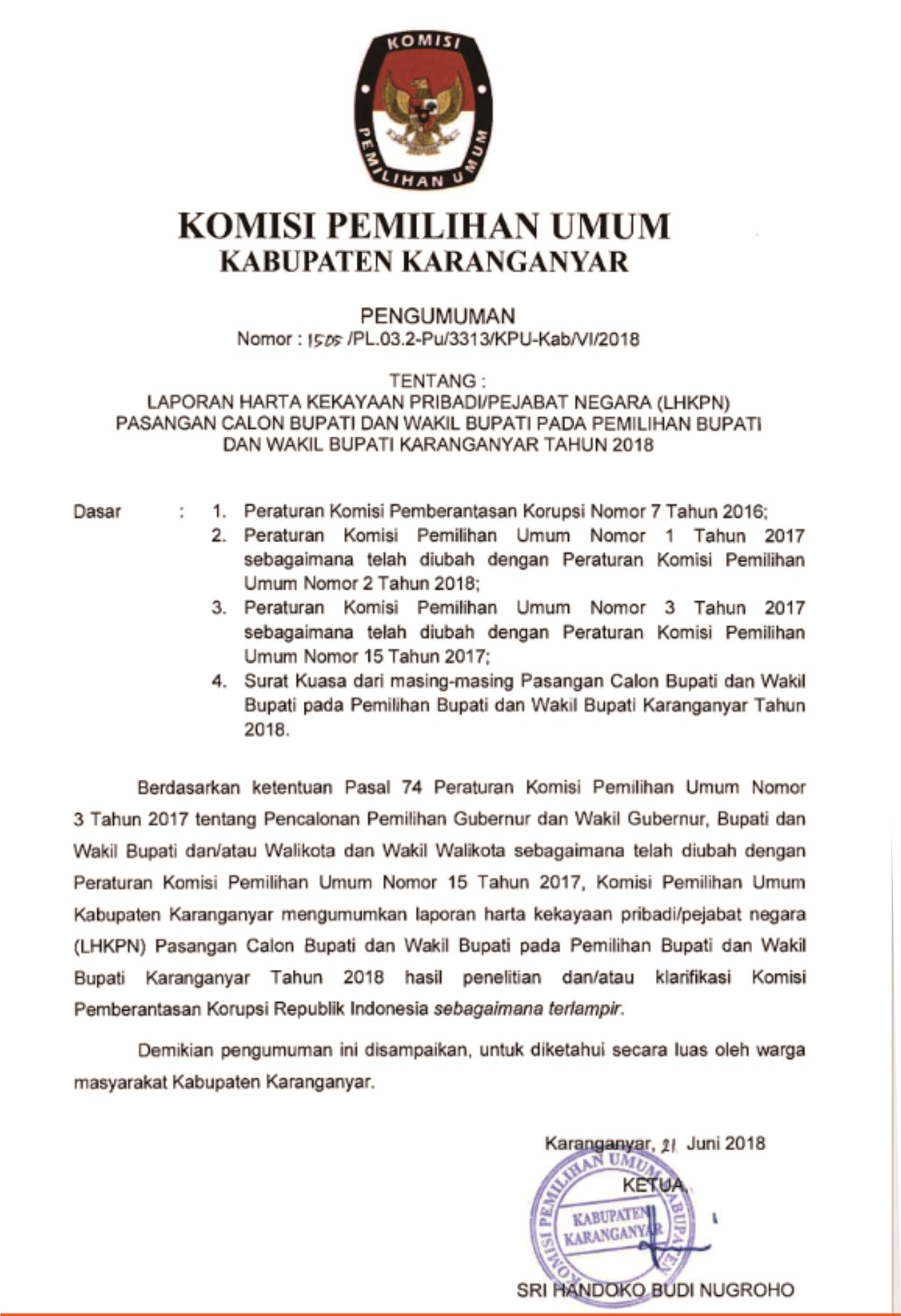 PENGUMUMAN LAPORAN HARTA KEKAYAAN PRIBADI PEJABAT NEGARA LHKPN PASLON BUPATI DAN WABUP 2018 Kamis, 21 Juni 2018 00:00 32 (DOWNLOAD DISINI) Bagikan: Telah dilihat 32 kali