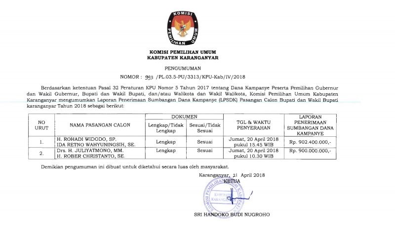 Pengumuman Laporan Penerimaan Sumbangan Dana Kampanye (LPSDK) Pasangan Calon Bupati dan Wakil Bupati Karanganyar Tahun 2018
