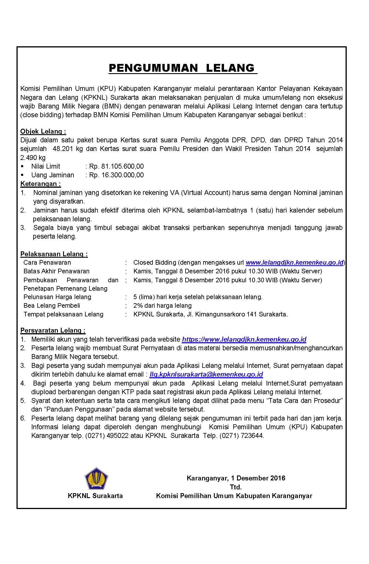 PENGUMUMAN LELANG Kamis, 01 Desember 2016 00:00 42 PENGUMUMAN LELANG UNDUH Bagikan: Telah dilihat 42 kali