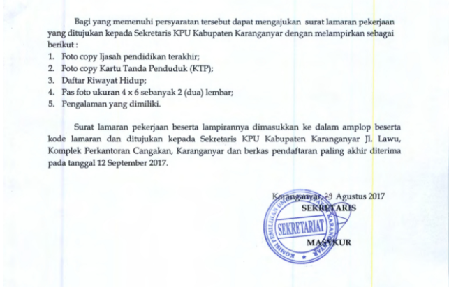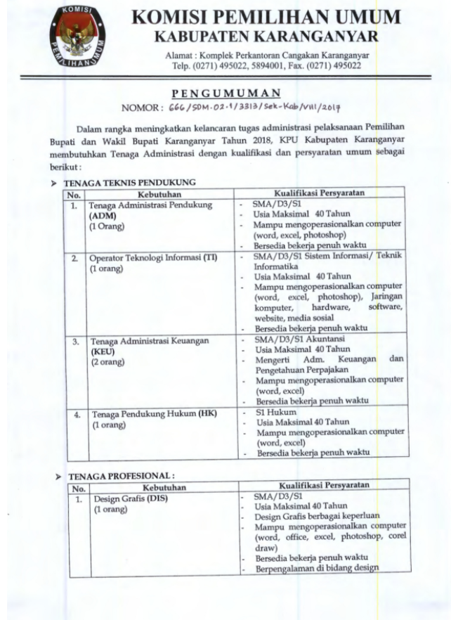 PENGUMUMAN Nomor : 666/SDM.02.1/3313/Sek-Kab/VIII/2017 (Lowongan Tenaga Administrasi Pemilu Bupati dan