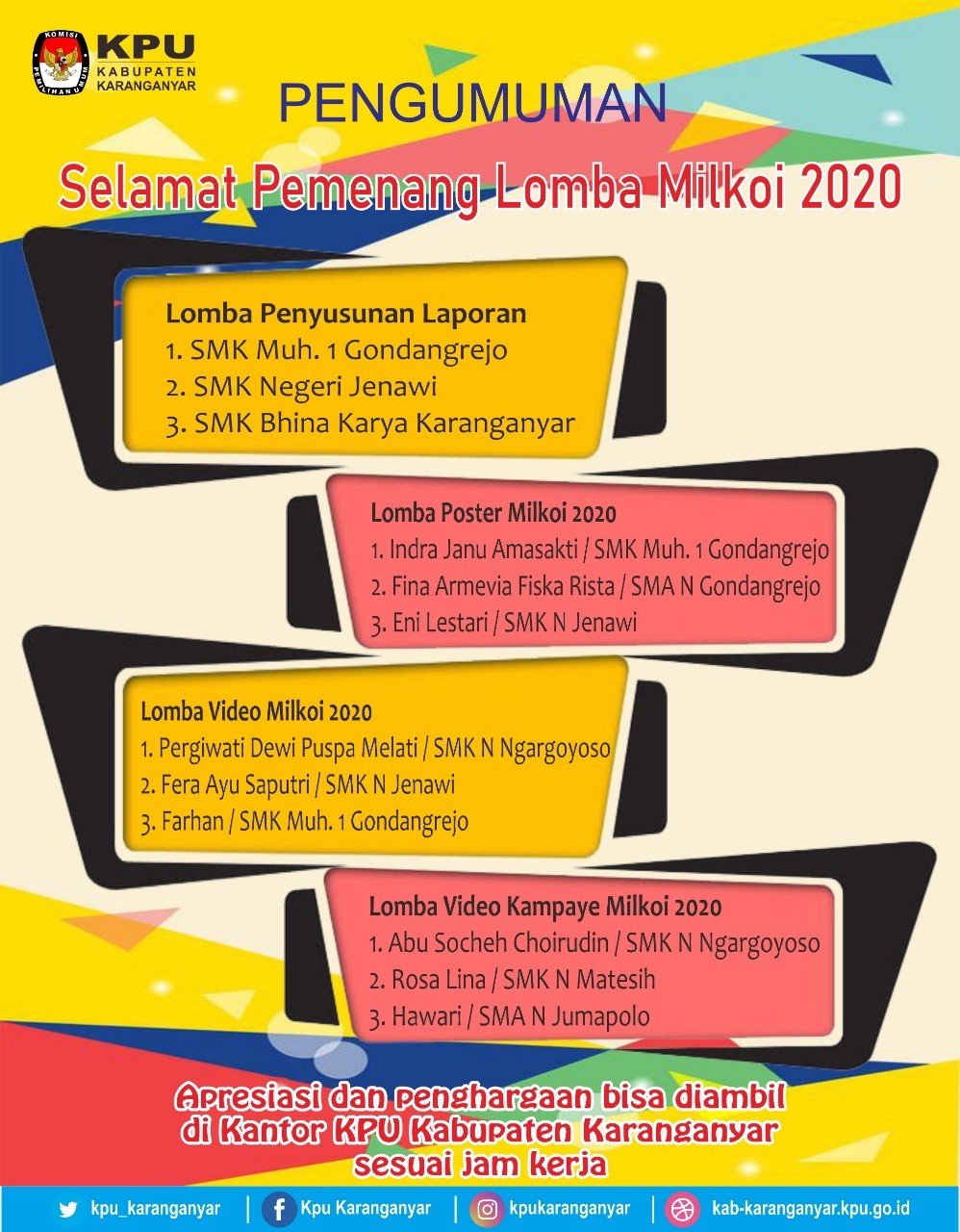 PEMENANG LOMBA DALAM PENYELENGGARAN MILKOI 2020 DITETAPKAN DENGAN KEPUTUSAN KOMISI PEMILIHAN UMUM KABUPATEN KARANGANYAR NOMOR : 34/HK.03.1-Kpt/3313/KPU-Kab/X/2020 TENTANG PENETAPAN PEMENANG LOMBA DALAM PENYELENGGARAAN PEMILIHAN KETUA OSIS SERENTAK TAHUN 2020 (MILKOI 2020) BAGI SMA/SMK/MA SE KABUPATEN KARANGANYAR.