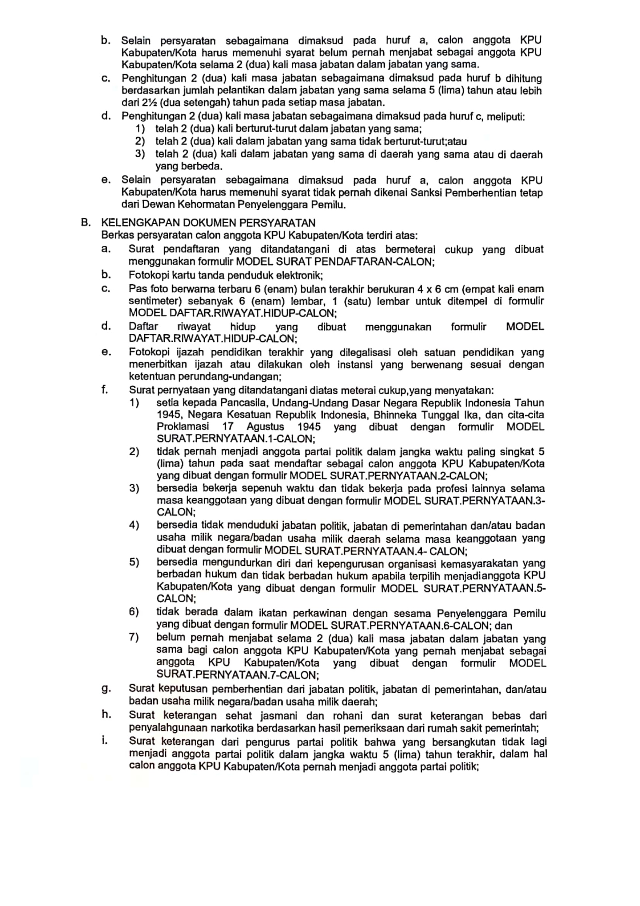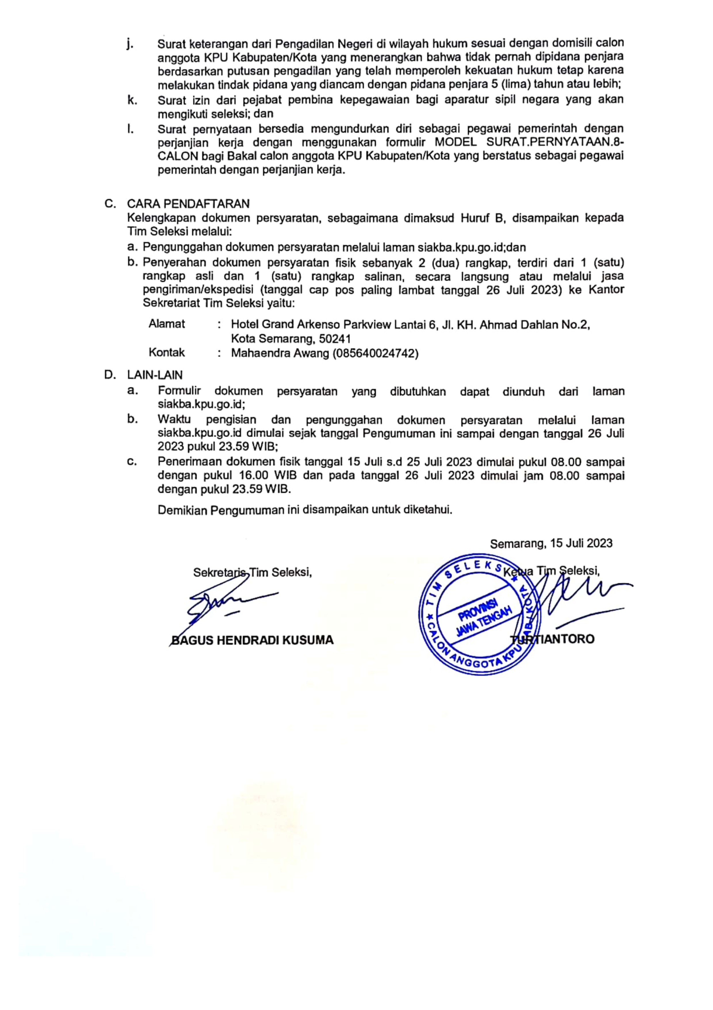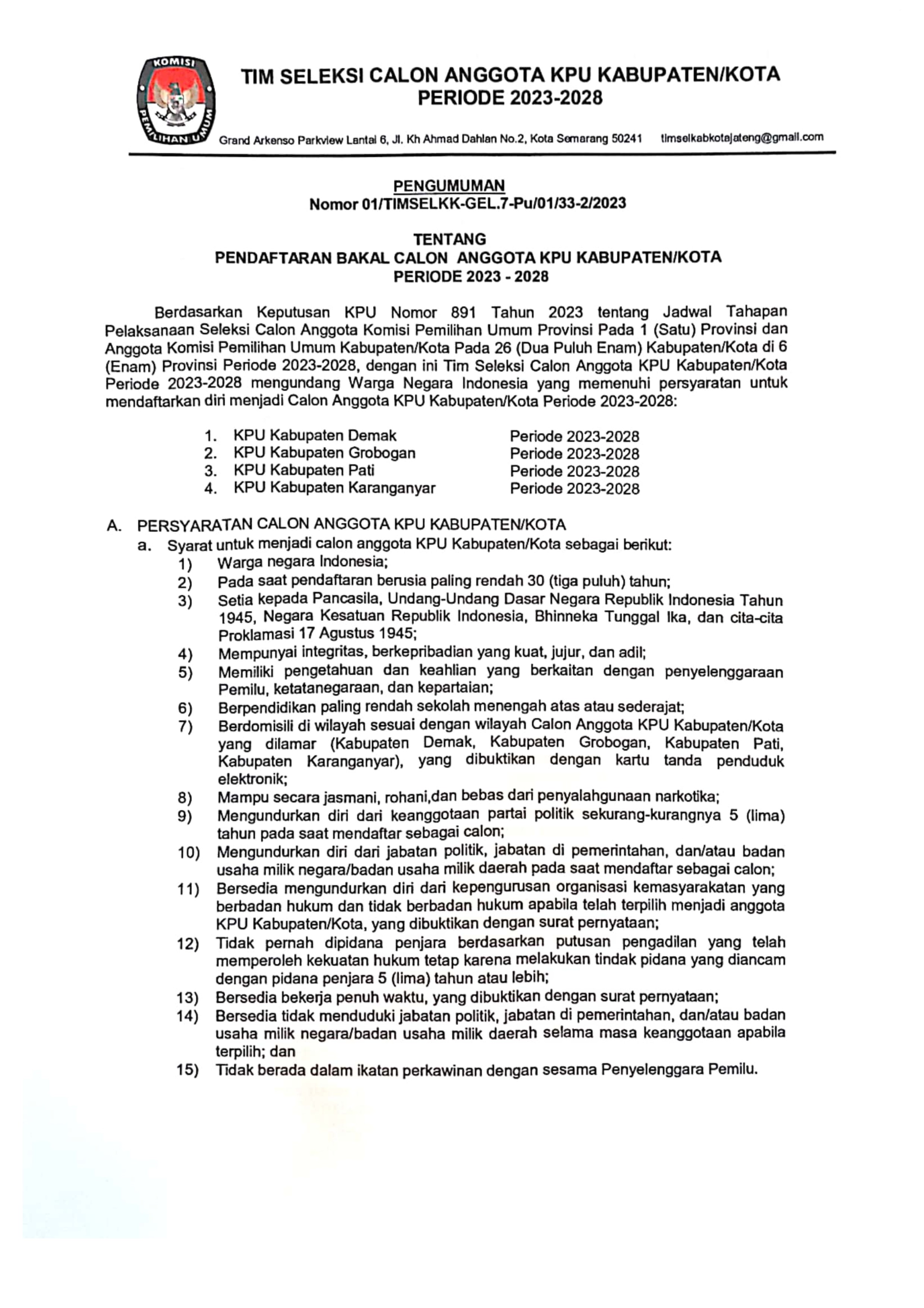 Pengumuman Pendaftaran Bakal Calon Anggota KPU Kabupaten/Kota Periode 2023-2028 Sabtu, 15 Juli 2023 07:00 150 DOWNLOAD FILE PENGUMUMAN Disini Bagikan: Telah dilihat 150 kali