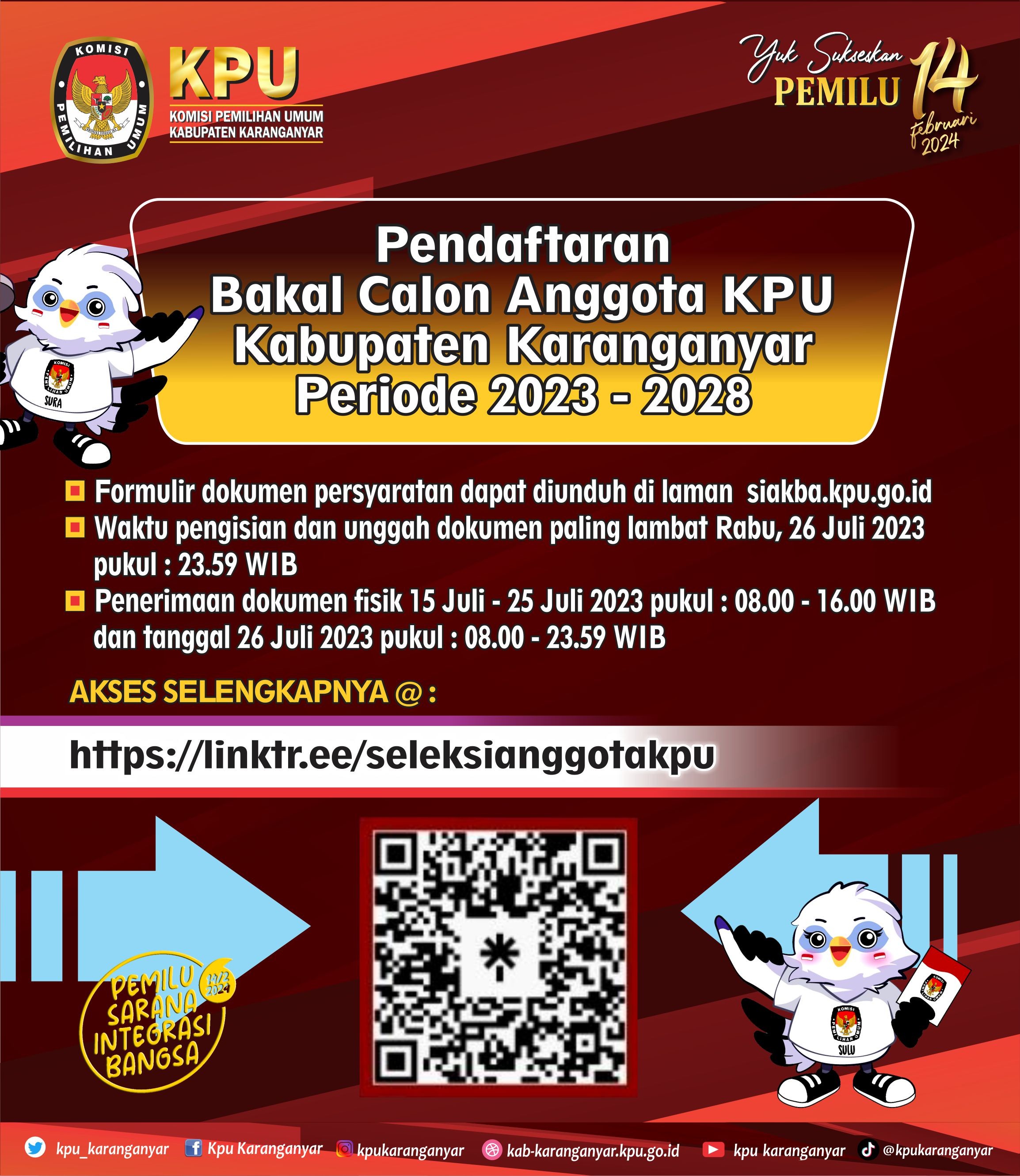 Pengumuman pendaftaran calon anggota KPU Kabupaten Karanganyar Periode 2023 - 2028. Kamu bisa akses di https://linktr.ee/seleksianggotakpu atau bisa scan QR Code di postingan ini.