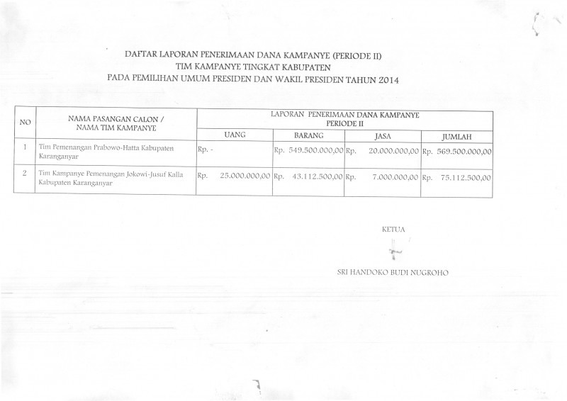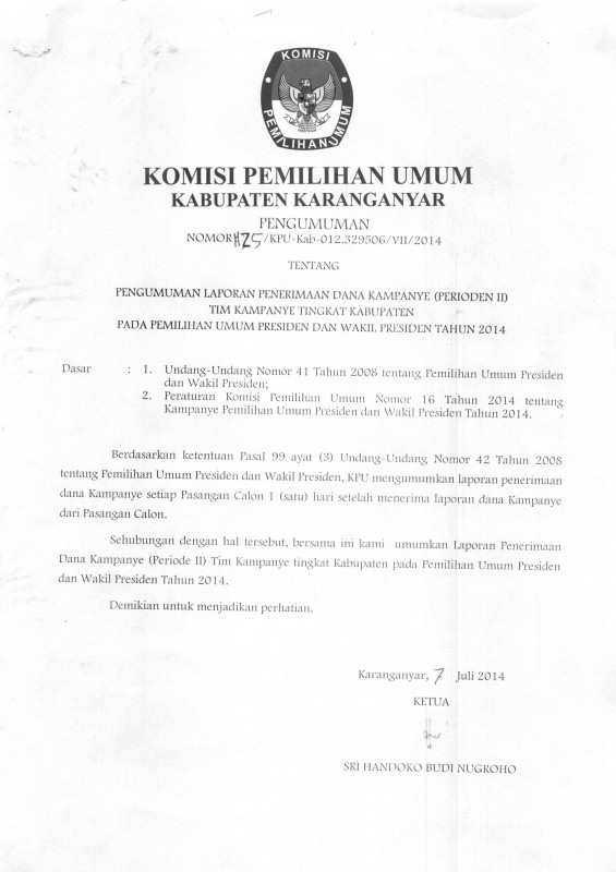 Pengumuman Penerimaan Dana Kampanye Pilpres 2014