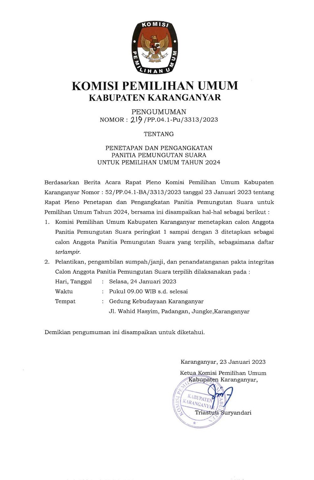 PENGUMUMAN PENETAPAN DAN PENGANGKATAN PPS UNTUK PEMILU 2024 Senin, 23 Januari 2023 18:21 387 DOWNLOAD PENGUMUMAN Bagikan: Telah dilihat 387 kali