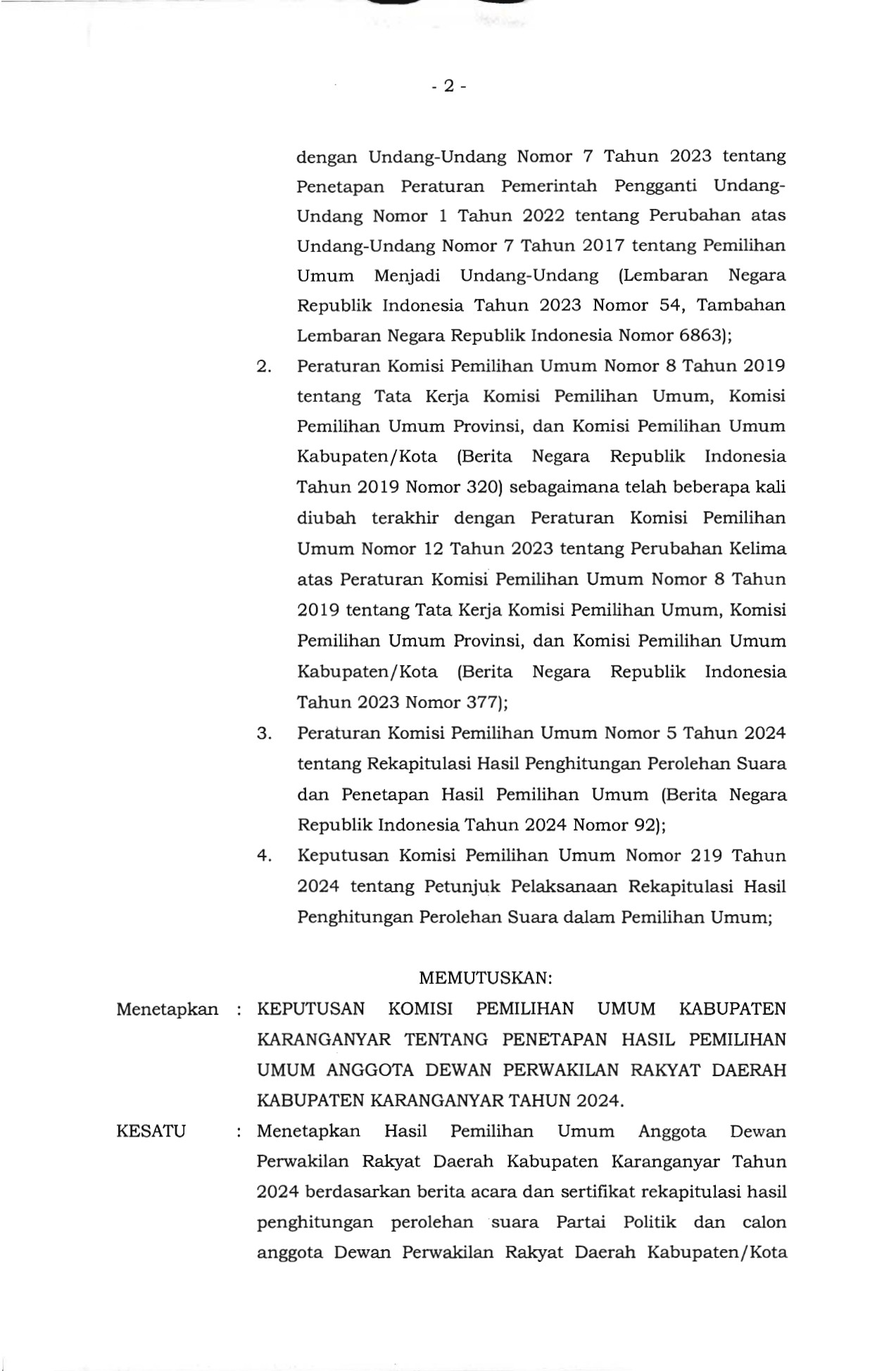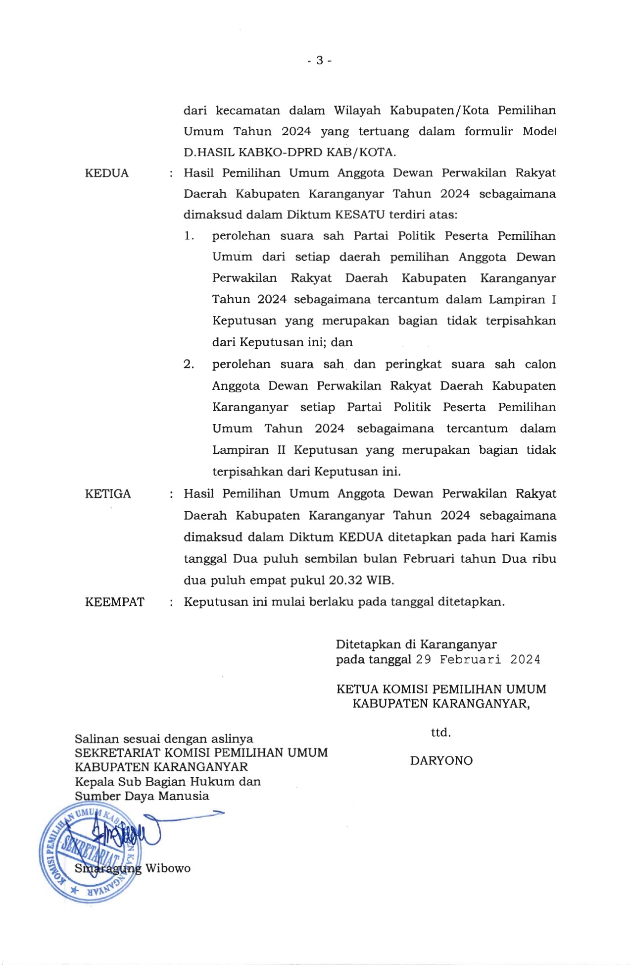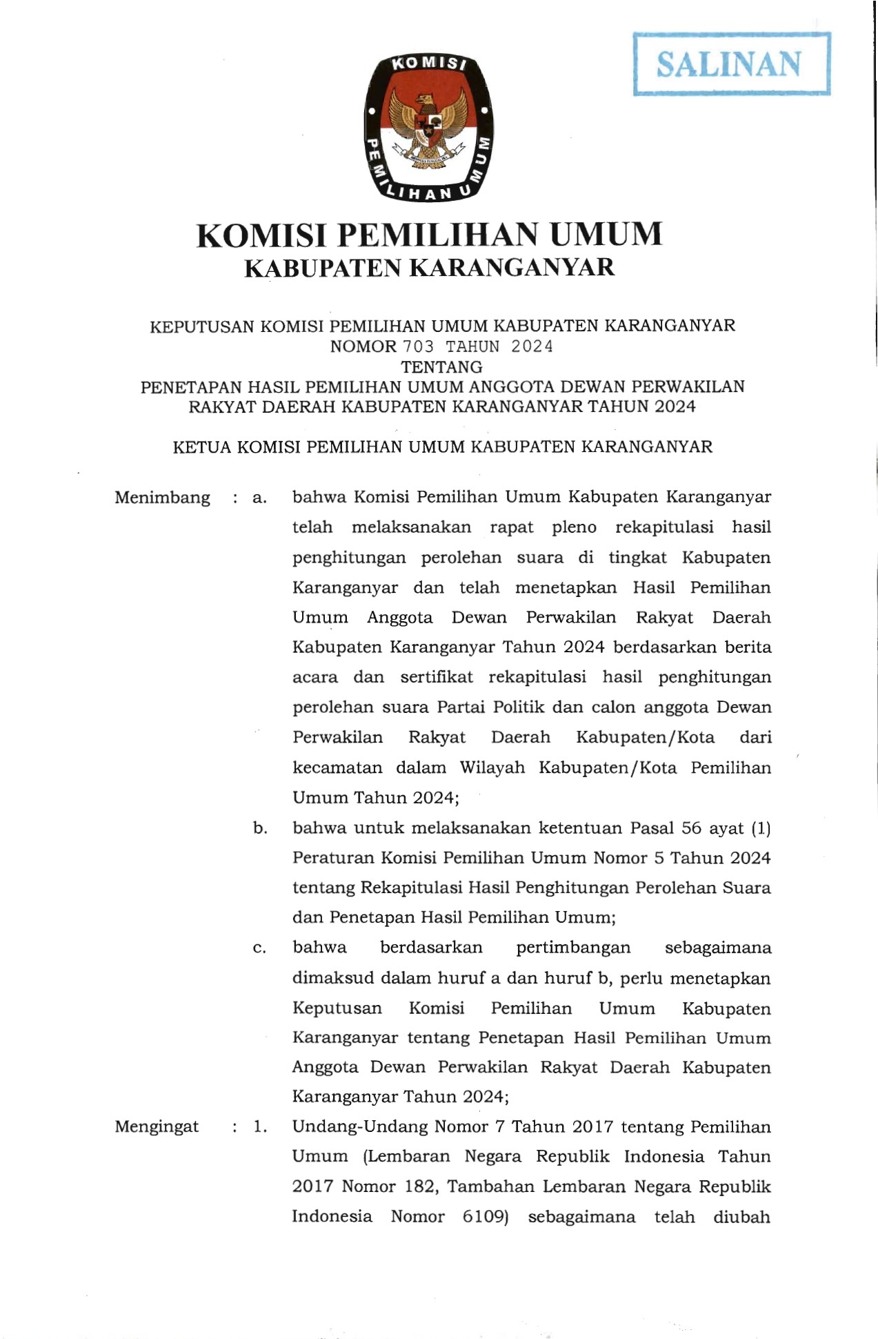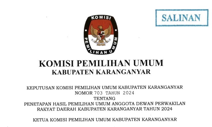 PENGUMUMAN PENETAPAN HASIL PEMILIHAN UMUM ANGGOTA DEWAN PERWAKILAN RAKYAT DAERAH KABUPATEN KARANGANYAR TAHUN 2024