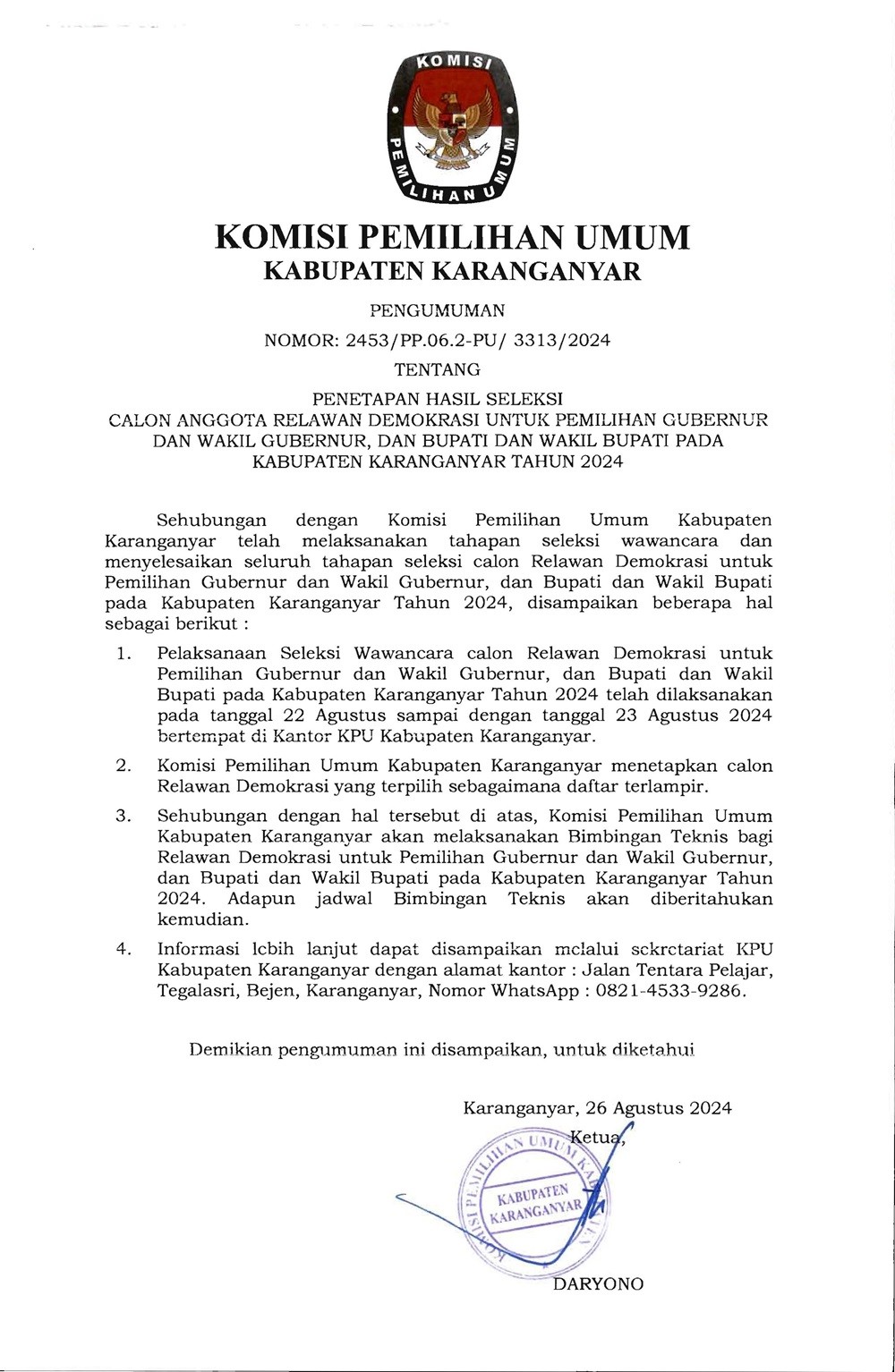 Pengumuman Penetapan Hasil Seleksi Calon Anggota Relasi Pilkada Tahun 2024 Senin, 26 Agustus 2024 18:00 248 DOWNLOAD PENGUMUMAN Bagikan: Telah dilihat 248 kali