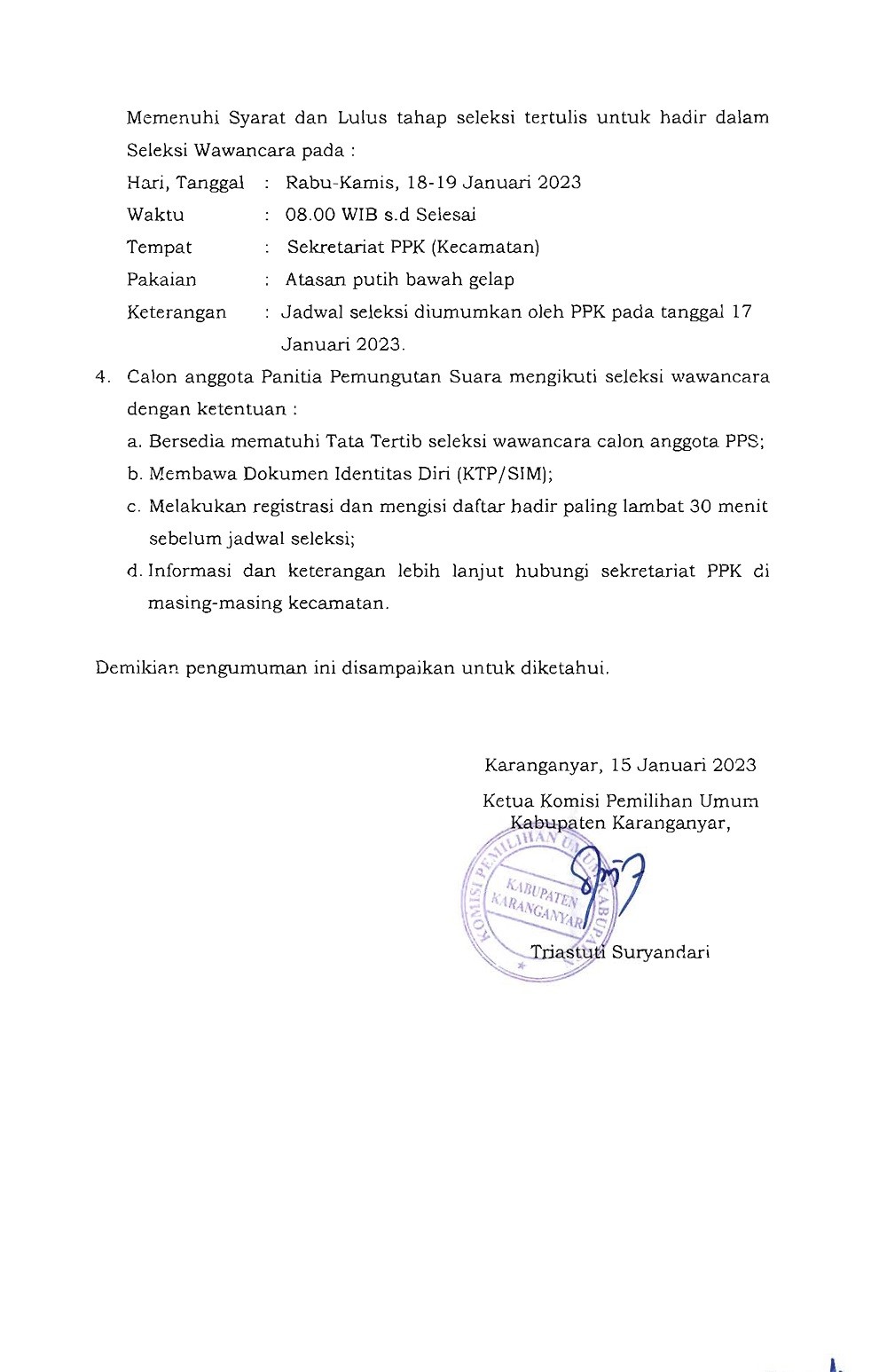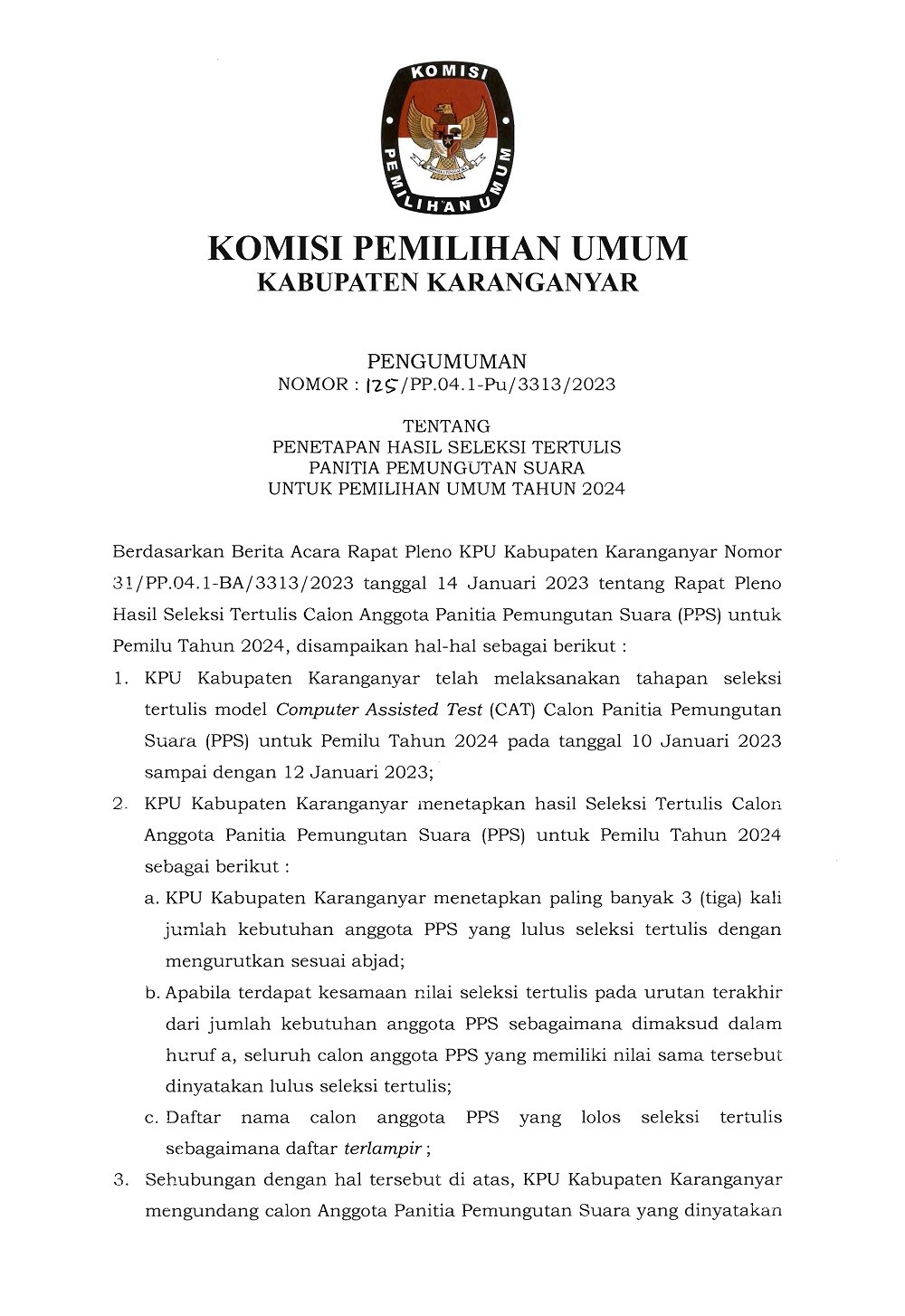 PENGUMUMAN PENETAPAN HASIL SELEKSI TERTULIS PPS UNTUK PEMILU 2024 Minggu, 15 Januari 2023 05:22 900 DOWNLOAD PENGUMUMAN Bagikan: Telah dilihat 900 kali