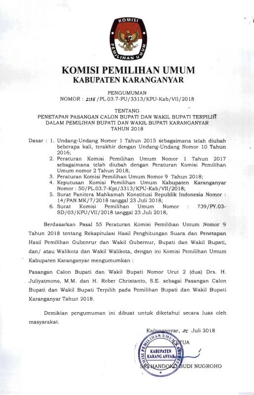 PENGUMUMAN PENETAPAN PASANGAN CALON BUPATI DAN WAKIL BUPATI TERPILIH DALAM PEMILIHAN BUPATI DAN WAKIL BUPATI KARANGANYAR TAHUN 2018