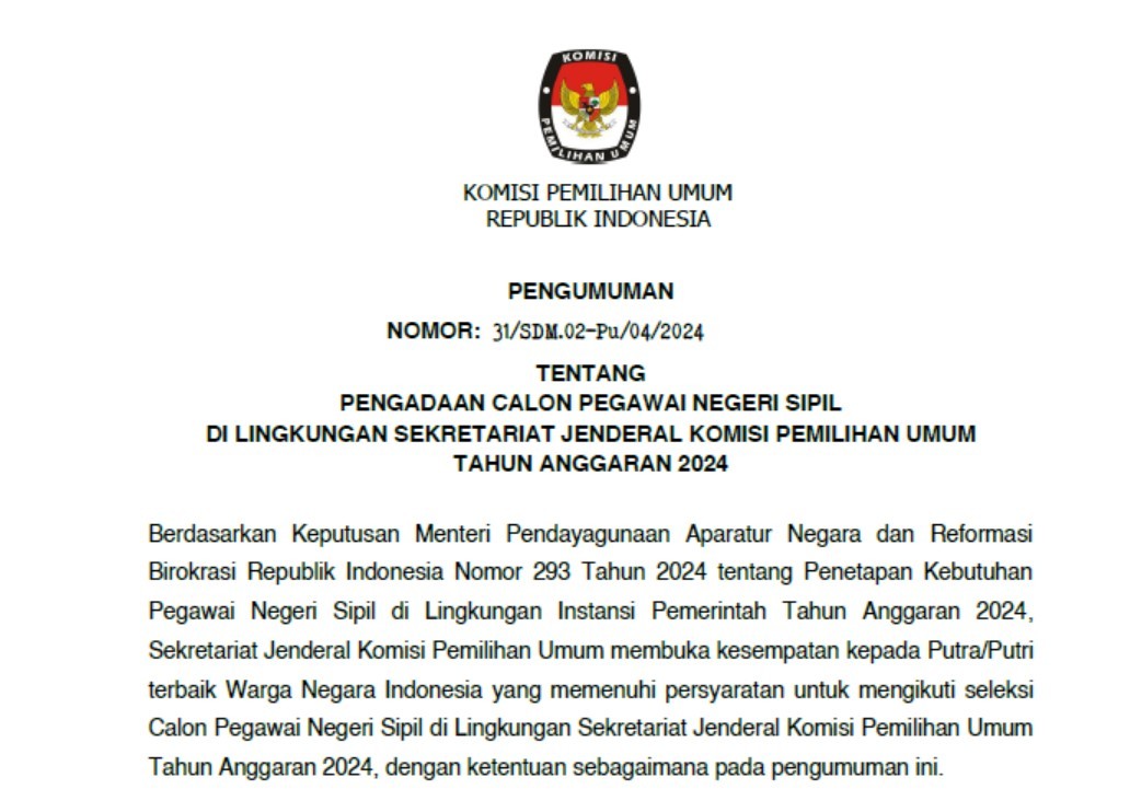 Jakarta, kpu.go.id - Pengumuman Nomor 31/SDM.02-Pu/04/2024 tentang Pengadaan Calon Pegawai Negeri Sipil di Lingkungan Sekretariat Jenderal Komisi Pemilihan Umum Tahun Anggaran 2024.