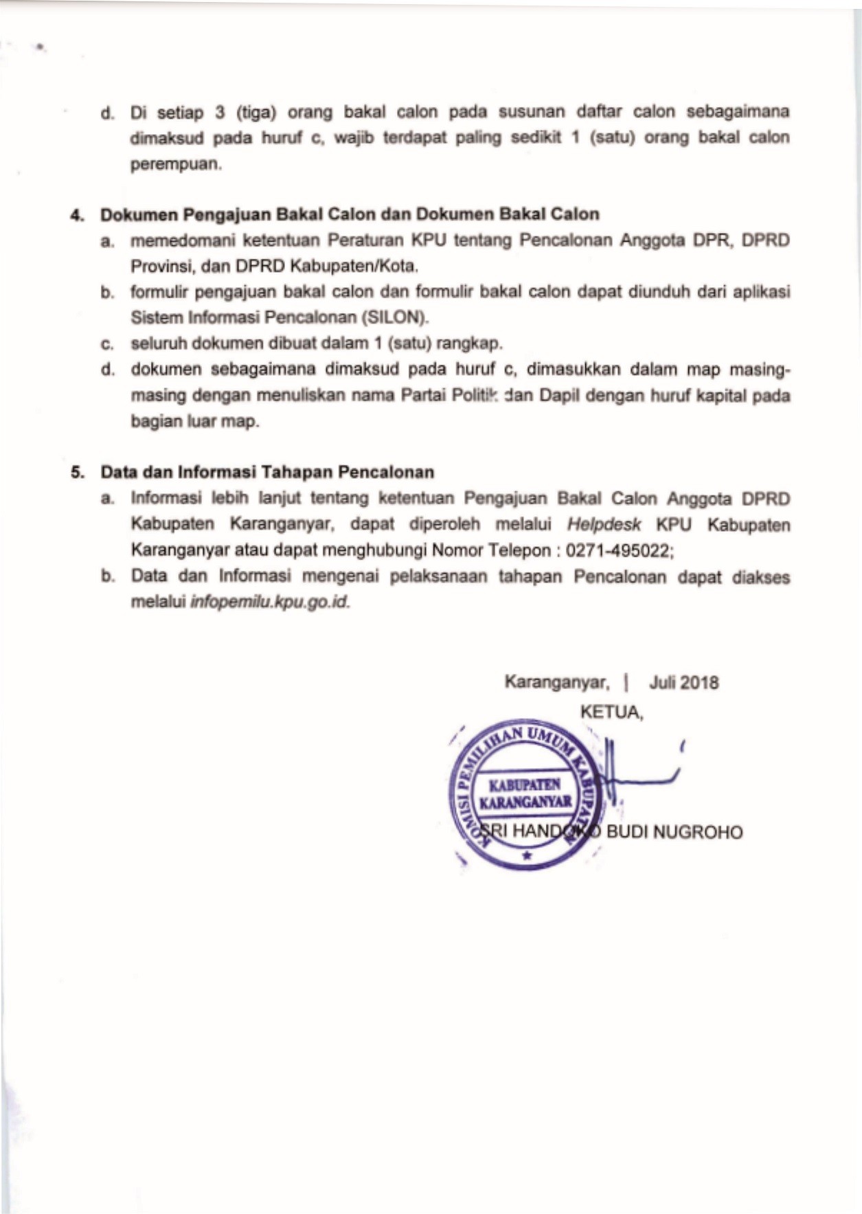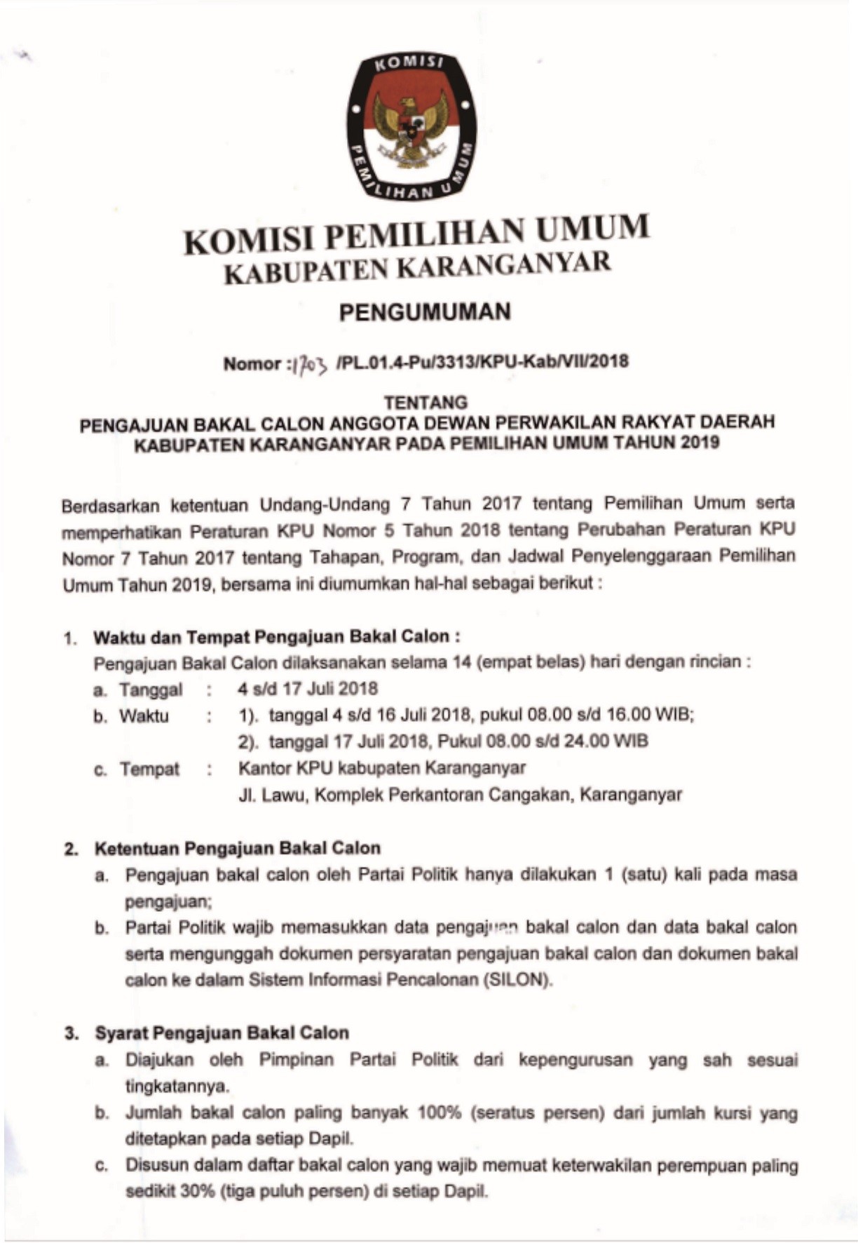 PENGUMUMAN PENGAJUAN BAKAL CALON ANGGOTA DEWAN PERWAKILAN RAKYAT DAERAH KABUPATEN KARANGANYAR PADA PEMILIHAN UMUM TAHUN 2019