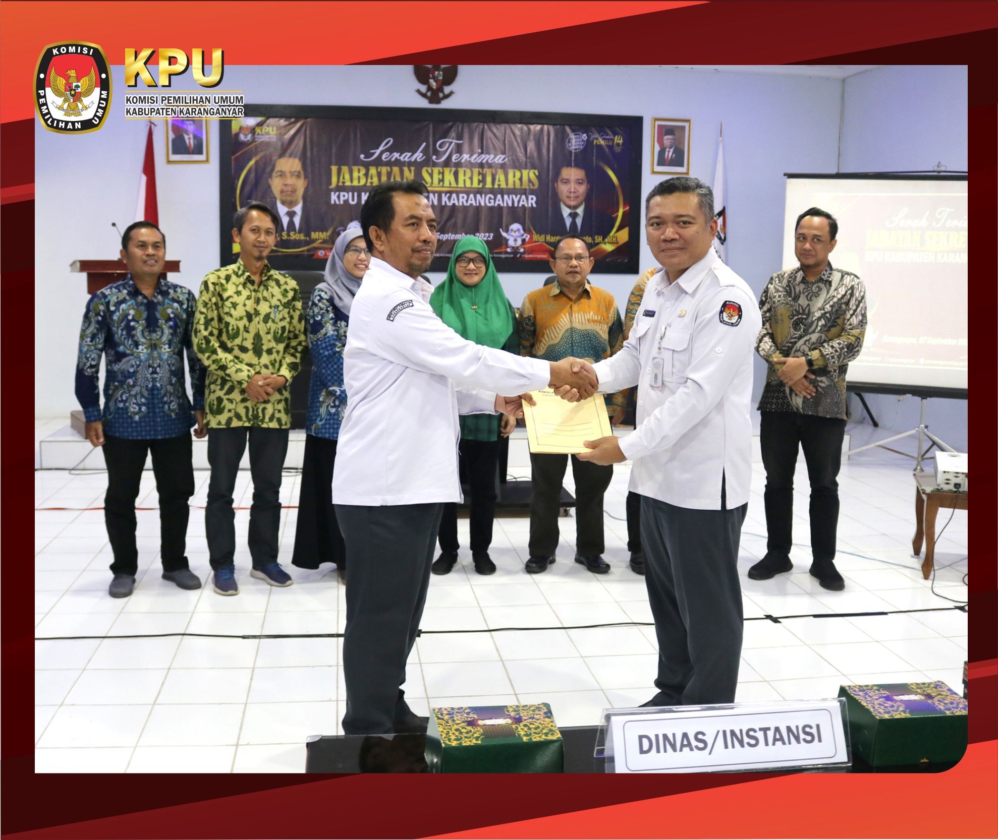 Ketua dan anggota KPU Kabupaten Karanganyar beserta pejabat struktural dan staf pelaksana menghadiri kegiatan Serah Terima Jabatan Sekretaris KPU Kabupaten Karanganyar di Ruang Aula KPU Kabupaten Karanganyar, Kamis (07/09/2023).