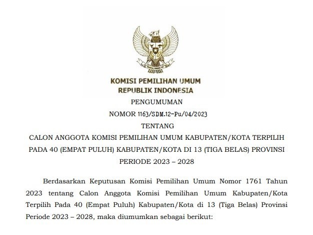 Pengumuman Calon Anggota Komisi Pemilihan Umum Kabupaten/Kota Terpilih pada 40 (Empat Puluh) Kabupaten/Kota di 13 (Tiga Belas) Provinsi Periode 2023-2028.