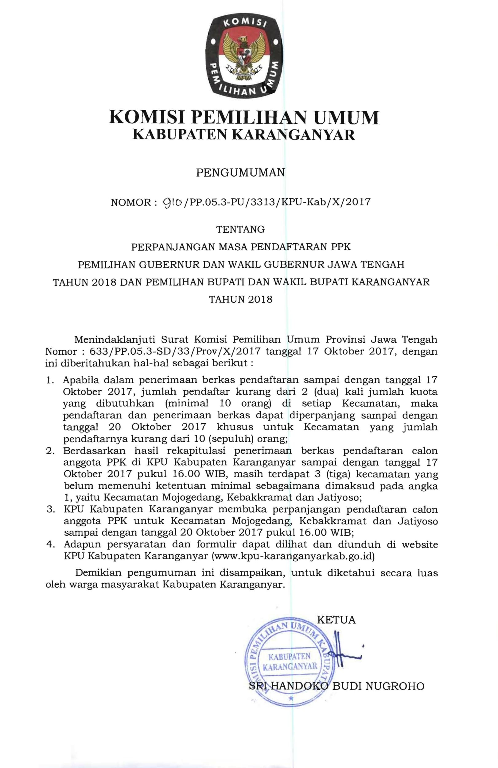 PENGUMUMAN Perpanjangan Masa Pendaftaran PPK Dalam Rangka PILBUB dan PILGUB tahun 2018 Rabu, 18 Oktober 2017 00:00 41 DOWNLOAD Bagikan: Telah dilihat 41 kali