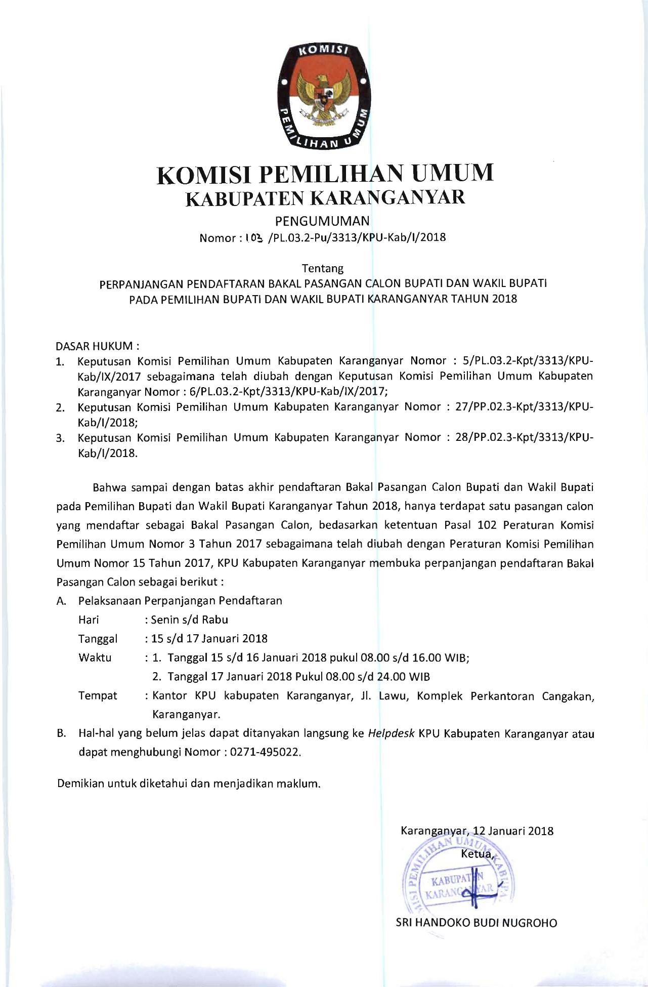 PENGUMUMAN PERPANJANGAN PENDAFTARAN BAKAL PASANGAN CALON BUPATI DAN WAKIL BUPATI PADA PEMILIHAN BUPATI DAN WAKIL BUPATI KARANGANYAR TAHUN 2018 Sabtu, 13 Januari 2018 00:00 40 DOWNLOAD Bagikan: Telah dilihat 40 kali
